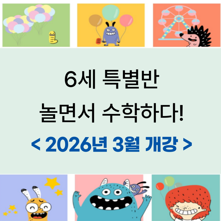 6세, 수학이 처음이라면? 놀이처럼 즐기며 자연스럽게 사고력을 키우는 게 가장 중요하죠. CMS 서초제2본원에서는 2026년 3월, 우리 아이의 첫 수학을 위한 6세 특별반을 새롭게 시작합니다! 수·조작 활동과 유아전용 교구를 활용한 놀이형 수업으로 “어려운 수학”이 아닌 **“재미있는 발견의 시간”**을 경험해 보세요~ 2026년 3월 개강! 6세 특별반 신규 오픈 ✔ 놀이 기반 수학 · 사고력 기초 완성 ✔ 유아 전용 교구 & 스토리텔링 활동 ✔ CMS만의 체계적인 Pre-Test 제공 ✔ 흥미·집중력·표현력까지 탄탄하게! ★ CMS만의 유아사고력 자체교재 사용! *1월 26일(월) ~ 2월 14일(토) 선착순 접수 중 매년 신청이 조기 마감되오니....... <img src="https://blogthumb.pstatic.net/MjAyNjAxMzBfMzgg/MDAxNzY5NzcxNzYwMTcy.mkwkNrQGHJM4AZjUKK-wvPyVj7ZUvg6rMZS3r_YQy1sg.9-PRzSdpD1UeNN3ibAEPSffIXPayyr7aZmhVbYEYDkwg.PNG/%C1%A6%B8%F1%C0%BB_%C0%D4%B7%C2%C7%D8%C1%D6%BC%BC%BF%E4._%2838%29.png?type=s3" />