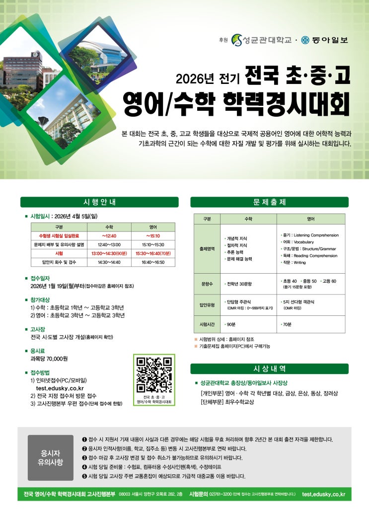 안녕하세요, 럭스아카데미입니다! 오늘은 곧 접수 마감 예정인 2026 성대경시대회 일정과 출제 범위, 공부 방법에 대해 알아보겠습니다! 성대경시대회 대회 정보 성균관대학교 전국 영어,수학 학력 경시대회 ⏱️ 일시 : 2026년 4월 5일 (일) ✅ 시간 : 입실시간 준수! 접수 기간 : 2026년 1월 19일(월) ~ 2026년 2월 22일(일) 취소는 시험 3월 15일(일)까지만 가능합니다. 고사장 변경 및 개인정보 수정도 3월 15일(일)까지만 가능합니다. 영어 : 초등학교 3학년 ~ 고등학교 3학년(초1,2학년은 초3학년부터 응시) 수학 : 초등학교 1학년 ~ 고등학교 3학년 (응시과목은 영어 또는 수학을 선택하여 1과목 응시도 가능함) 기출문제집 구....... <img src="https://blogthumb.pstatic.net/MjAyNjAyMDNfMjkg/MDAxNzcwMTE4Nzc3OTcz.OzijfS4OCtsi4FtgVmppNLjsOZ9GHX3aYhIfvYA0IdYg.sJceF0xxHQ16ngv9RDh463fcKBlSctLLSp7doCZZK48g.JPEG/51%C8%B8%BC%BA%B4%EB%BD%C3%C7%E0%BF%E4%B0%AD.jpg?type=s3" />
