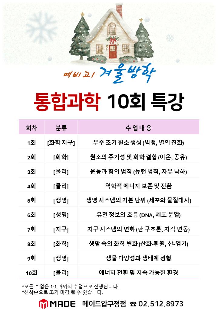 고등과학내신 자신감의 시작 통합과학 100점 만들기 완성 특강 2026겨울방학 통합과학 10회 특강 안내-최진섭T 안녕하세요 신사동과학학원 메이드입니다 예비고1 학생들에게 이번 겨울방학은 단순한 ‘방학’이 아니죠 고등 3년의 방향을 정하는 출발점입니다. 이 시기를 어떻게 보내느냐에 따라 고등에서의 학습 리듬은 크게 달라집니다. 그중에서도 통합과학은 준비 없이 지나가기 어려운 과목입니다. #신사동과학학원 암기로 버티던 중등 과학과 달리, 고등 통합과학은 개념을 연결하고 이해하는 힘을 요구하기 때문이죠. 그래서 이번 겨울방학은 통합과학을 대충 넘길 수 없는 시기이기도 합니다. 신사동과학학원 중학교 때 과학이 유독 어렵....... <img src="https://blogthumb.pstatic.net/MjAyNTEyMTNfNTgg/MDAxNzY1NjA4NzMzNTcy.R7jNn1M4Xbt9Z8RGZaWes90zpm7XSCujwcvpXeVm6lUg.tsorVKhD8U15PqeW2CIN6yQ2eT3Dg60dVhQwBKQ4GXUg.PNG/%BD%BD%B6%F3%C0%CC%B5%E51.PNG?type=s3" />