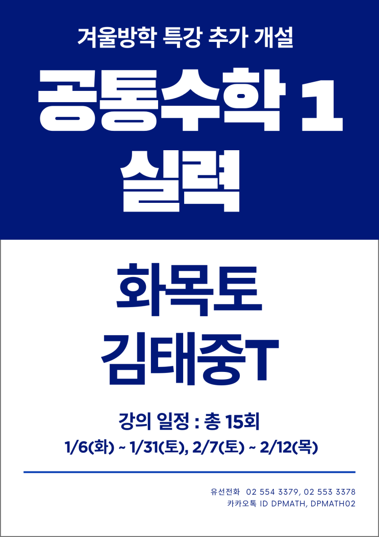 ★공통수학1 실력 추가 개설★ 공통수학1 실력과정 대기자가 다수 발생함에 따라 문의가 많아 추가 반을 개설합니다. ※ 공통수학1 기본 / 실력 과정의 경우 19개 단원 중 15단원까지만 진도 나갑니다. ◆ 고등과정 특강 대기 접수 링크 ◆ https://forms.gle/MZrwCYRyYSZjveyv9 <img src="https://blogthumb.pstatic.net/MjAyNTEyMTdfMjYg/MDAxNzY1OTQ3MjQyNzM2.8Z3j___wkd9DiDzTpdd757x5aWLLxcVl2HUMeH89Rxsg.eHaDhNyLGYtRlGZgPR99Wom8PWokNK4JRFCKRArXBBAg.PNG/KakaoTalk_20251217_135142545.png?type=s3" />