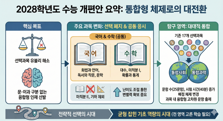 예비 고2 학생들이 치르게 될 2028학년도 대학수학능력시험(이하 수능)은 선택형 체제의 종결과 함께 통합형 체제로의 대전환 시대를 맞이한다. 교육부가 발표한 개편안의 핵심은 과목 선택에 따른 유불리 논란을 완전히 해소하고, 문·이과 구분 없는 융합형 인재를 선별하는 데 방점이 찍혀 있다. 2015 개정 교육과정부터 도입된 국어와 수학 영역의 선택과목이 폐지되는 것이 손에 꼽히는 특징 중 하나이다. 기존 국어와 수학의 과목 선택 방식은 수험생이 어떤 과목을 선택하느냐에 따라 표준점수에서 득실이 발생하는 구조적 한계가 있었다. 하지만 2028학년도부터 국어는 ‘화법과 언어, 독서와 작문, 문학’, 수학은 ‘대수, 미적분 I, 확....... <img src="https://blogthumb.pstatic.net/MjAyNjAyMDVfMjI3/MDAxNzcwMjc4NjkxMjkx.W1bmhPBEetc61WbNmbfdyC7kBM899x6m8H1KH92kUBIg.JCuU8PWR1eTbbZ3SBZ3tzaZNwV2sXn1pmLh3idjN67Ag.PNG/2%BF%F91%C1%D6%C2%F7.png?type=s3" />