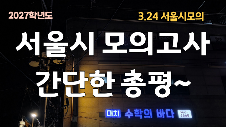 안녕하세요? 수종샘입니다. 3월24일 서울시 교육청 모의고사 수학부분에 관한 간단한 총평 적어보겠습니다. 교육청 모의고사는 모든 과목 시험이 끝나는 저녁부터 시험지를 공개하기 때문에 당일에 문제를 풀어보고 분석을 하기가 어렵네요. 때늦게 분석글 올리게 되어 아쉽습니다. 이번 서울시 모의고사는. 1) 범위가 좁아서 반복출제되요. 서울시 교육청모의고사는 수학선택과목의 범위가 극히 일부만 포함됩니다. 그런 이유로 미적분, 확률과 통계,기하 파트에서는 매년 출제되는 개념과 유형의 문제들이 반복출제되고 있습니다. 즉 지난 3~4개년 정도의 서울시 교육청 문제를 풀어본 직후 이번 모의고사를 본다면 서울시 교육청모의고사의 출....... <img src="https://blogthumb.pstatic.net/MjAyNjAzMjZfMjc0/MDAxNzc0NDg0NjY3NTQw.0NPlKV96skOVqEGWzengfNayJCqWaVvCmvEGbErAWsEg.V7weX7dmlgMKs3gttPVQInxP_PTTm8_R4Vi5DZUA77sg.PNG/%C1%A6%B8%F1%C0%BB_%C0%D4%B7%C2%C7%D8%C1%D6%BC%BC%BF%E4._%2877%29.png?type=s3" />