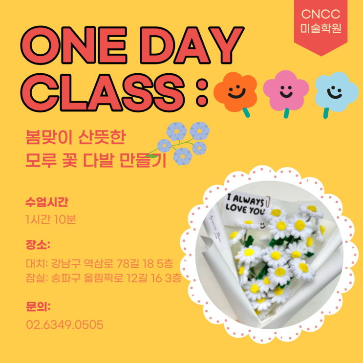산뜻한 봄이 오고 개나리, 벚꽃, 목련 등 봄을 알리는 꽃들이 여기저기 만개를 했어요! 그래서 이번에는 봄을 맞이해서 모루로 꽃다발을 만들어보려고 합니다. *유치원생 친구들도 만들수 있는 쉬운 레벨도 가능합니다:) 아이들이 보들보들한 모루를 만지면 얼마나 좋아하는지 손에 감각도 깨우고 예쁜 꽃다발도 만들고 얼마나 즐거울까요! 1:1부터 그룹까지 다 가능하니 문의주세요 010.9270.8069 또는 02.6349.0505 <img src="https://blogthumb.pstatic.net/MjAyNjAzMzBfNTEg/MDAxNzc0ODUyNDc4ODYw.uRc2q15Vn4MpHZkW0vq1NxiyIeBj5Arvcg2CZK-x7Jcg.9voZOPXnOdncSf3ph1v91KDM4BaETCjAvrMv6OI7fMUg.PNG/%C1%A6%B8%F1%C0%BB_%C0%D4%B7%C2%C7%D8%C1%D6%BC%BC%BF%E4..png?type=s3" />
