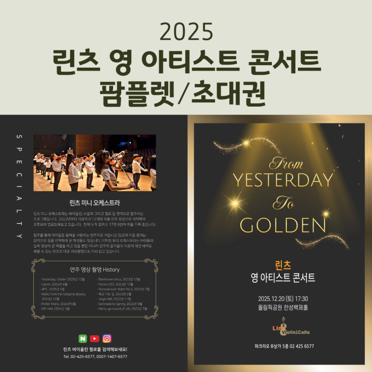 이제 며칠 후면 잠실 음악학원 린츠 바이올린 첼로에서 준비하고 있는 2025년 린츠 영 아티스트 콘서트가 있을 예정인데요. 한성백제홀에서 진행되는 이번 행사에 사용될 팜플렛과 초대권 제작이 최근 완료되었어요. 연주회에 앞서 제작물 내용을 미리 공유합니다. 아래는 팜플렛 2페이지와 3페이지입니다. 특히 이 중에서 프로그램이 궁금하실 것 같아 따로 한 장 올립니다. 아울러 초대권 전면과 후면 사진입니다. 이번 주 토요일에 한성백제홀에서 만나요~ <img src="https://blogthumb.pstatic.net/MjAyNTEyMTdfMTcg/MDAxNzY1OTc0NDYyNzEz.r-8U_K19gKdQ9jkH0RgQF-397uIx1wZav0j2u7ljtq0g.l7K_Lr9BkPz0c7PbcVZQKj8LmGFjifJ7fT1npeo-UNIg.PNG/1.png?type=s3" />