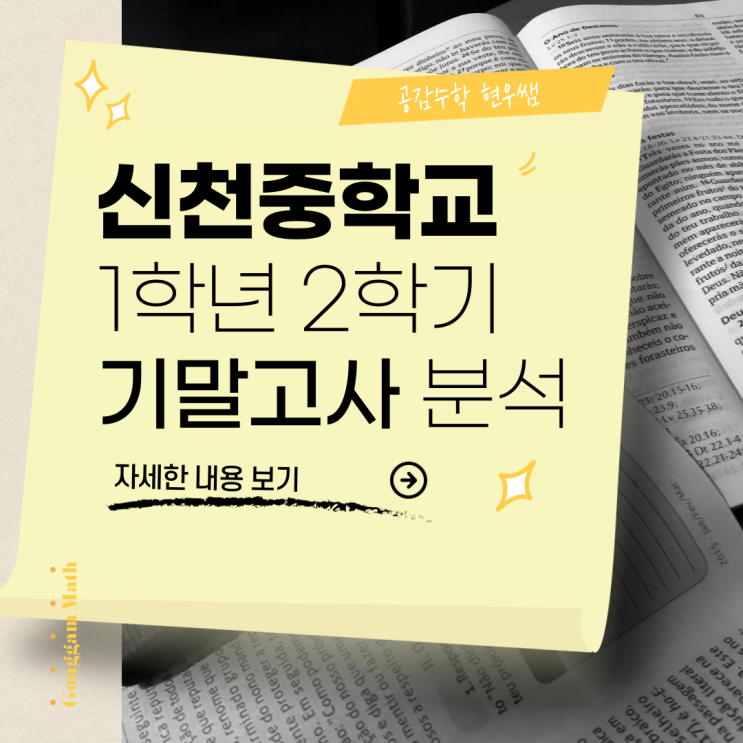 안녕하세요 현우쌤입니다. 25년도 기말고사를 치른지 조금 되었지만 오늘은 25년도 신천중 1학년 2학기 기말고사는 어떻게 출제되었는지 살펴보도록 하겠습니다. 시험 정보 * 문항수 점수 배치: 선택형 24문항(100점) = 총 24문제(100점) * 시험범위 : 평면도형 ~ 입체도형 * 단원별 문항수 - 평면도형 : 객관식 12문항 - 입체도형 : 객관식 12문항 시험 총평 25년도 신천중학교 1학년 2학기 기말고사는 서술형 없이 객관식으로만 총 24문항이 출제가 되었습니다. 출제 단원은 평면도형과 입체도형이 12문항씩 골고루 출제가 되었고, 출제 순서는 배점순이 아니라 단원순으로 출제되면서 1학년 학생들에게 처음으로 시간 관리의 필요성을 느....... <img src="https://blogthumb.pstatic.net/MjAyNjAxMDZfMjgg/MDAxNzY3Njg2NjI5MjI0.PLciJWxJ7kuOr9flb4bl9gGhBqZJHejr2a9NxVEJ3MAg.h_D2VbgBHuU9T0sZKrgnxtInWi9AEZTl_TnGHknRH64g.PNG/%C1%A6%B8%F1%C0%BB-%C0%D4%B7%C2%C7%D8%C1%D6%BC%BC%BF%E4_-001_%2897%29.png?type=s3" />