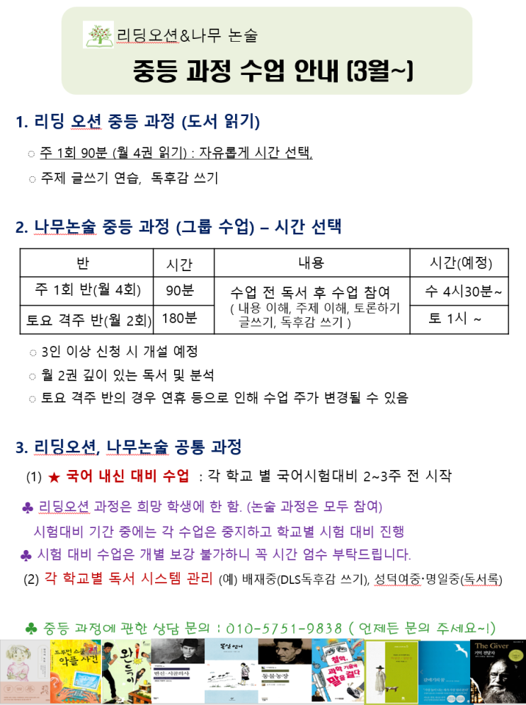 리딩오션&나무논술(명일점) 중등 과정 수업(3월~)