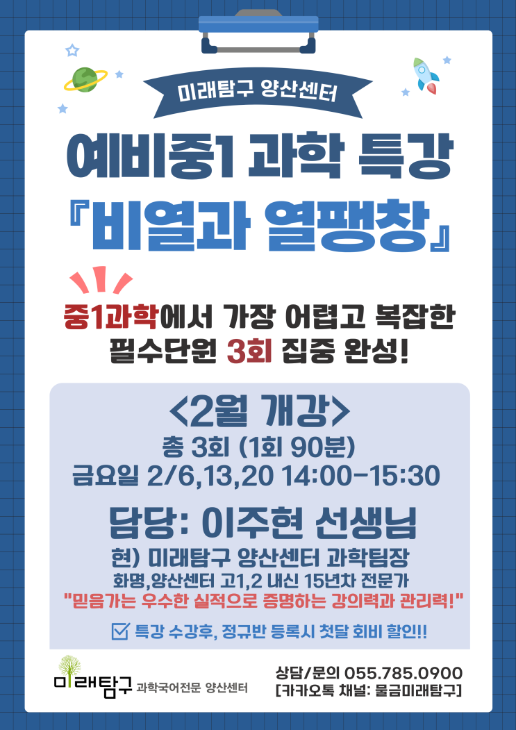 예비중1 과학, 어디서 시작해야 할지 고민이라면? 중1 과학에서 가장 어렵고 복잡한 핵심 단원, 비열과 열팽창을 단 3회로 집중 완성! 미래탐구 양산센터에서 예비중1을 위한 과학 특강이 2월에 개강합니다 [ 특강 안내 ] 개강 : 2월 예정 수업 횟수: 총 3회 (1회 90분) 일정 : 2/6, 2/13, 2/20 (금) 시간 : 14:00 ~ 15:30 담당 : 이주현 선생님 (현 미래탐구 양산센터 과학팀장 / 내신 15년차 전문가) 특강 수강 후 정규반 등록 시 첫 달 회비 할인 혜택까지! [ 신청 방법 ] ☎️ 학원 전화 미래탐구 양산센터 (055.785.0900) 카카오톡 채널 1:1 채팅 ▶ 전화 상담 가능 시간 평일 2:30PM ~ 9:00PM 토요일 10:00A....... <img src="https://blogthumb.pstatic.net/MjAyNjAxMTJfMjAz/MDAxNzY4MjA1ODA0MDg1.xwlK115GGm2caa99Q5FZ85Ss14EbSRSRrebs-4WPr-gg._M7zkRS2FEjq5yga7mUHKmXb8I26jNtmaQIVPRz17DEg.PNG/image.png?type=s3" />