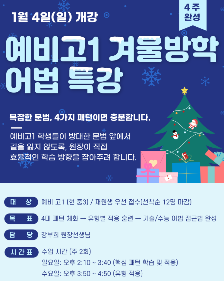 예비고1 학생들이 방대한 문법 앞에서 길을 잃지 않도록, 원장이 직접 가장 효율적인 학습 방향을 잡아주려 합니다. "복잡한 문법, 4가지 패턴이면 충분합니다." 무작정 암기하는 것이 아니라, 고등 어법을 관통하는 4가지 핵심 패턴을 학습하여 아이들이 스스로 유형에 적용하고, 나아가 수능 어법 문제까지 수월하게 접근할 수 있도록 돕겠습니다. ■ 강의 안내 담당: 강부희 원장 목표: 4대 패턴 체화 → 유형별 적용 훈련 → 기출/수능 어법 접근법 완성 대상: 예비 고1 (현 중3) 재원생 우선 접수 / 선착순 12명 마감 최소 인원 6명 미만 시 폐강될 수 있습니다. ■ 일정 및 시간 (4주 완성) 개강일: 1월 4일 (일요일) 수업 시간....... <img src="https://blogthumb.pstatic.net/MjAyNTEyMTlfMTA4/MDAxNzY2MTIwOTcwMzU3.sPRiL3zbWKo3MBzMmD-xJwDsJY0VwrC8wUIyg1INSL0g.2Vu3HmZtpKhVXF2V-lan15rvQpDiu2jUo6gcJzex0Z0g.PNG/%C1%A6%B8%F1%C0%BB-%C0%D4%B7%C2%C7%D8%C1%D6%BC%BC%BF%E4_-001_%2819%29.png?type=s3" />