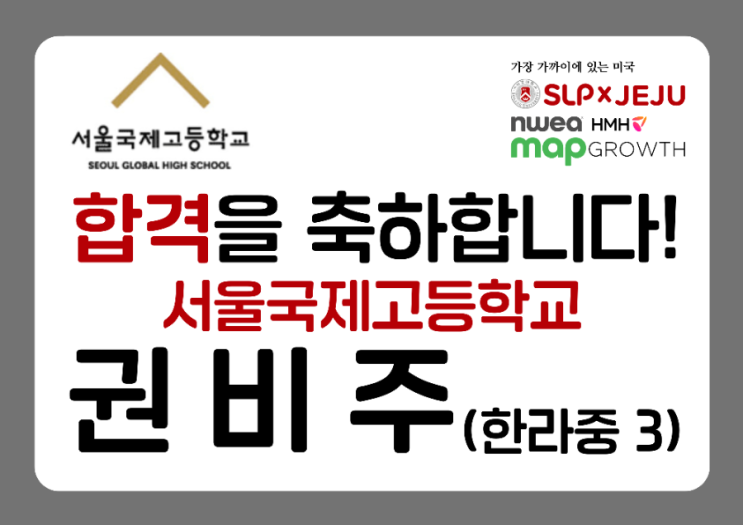 안녕하세요? JEJU SLP 입니다! 오늘은 정말 기쁜 소식을 전해드릴 수 있어 너무나도 감사하고 행복한 JEJU SLP 입니다! 2020년부터 5년을 함께해 온 우리의 권비주(한라중 3) 친구가 올해 특히 치열했던 경쟁률을 뚫고 서울국제고등학교에 당당하게 합격을 했습니다! ↓↓↓↓↓↓↓↓ 서울국제고는 서울 유일의 공립 국제고로 심화 학술 활동 및 보고서·발표 중심 수업과 해외 연계 프로그램 및 글로벌 리더십 교육으로 “영어 잘하는 아이”가 아니라 영어로 공부할 수 있는 아이를 선발합니다. 서울대 포함 상위권 대학 진학 실적 및 해외 진학실적도 꾸준히 증가하고 있습니다. (2024학년도: 10명 → 2025학년도: 15명 해외대 진학) 내신 5등....... <img src="https://blogthumb.pstatic.net/MjAyNTEyMTlfMjMg/MDAxNzY2MTM1MTQxNjcz.31nIoQ8abTGOV5N43vM5GmSwnLcyH_q9MITjInkLVhQg.yQmHpZXMh5N8sqsxCIP-9XTy3KlzfsbpvQNLPe_Bysog.PNG/900%A3%DF1%A3%DF20251219%A3%DF175909%A3%DF0000.png?type=s3" />