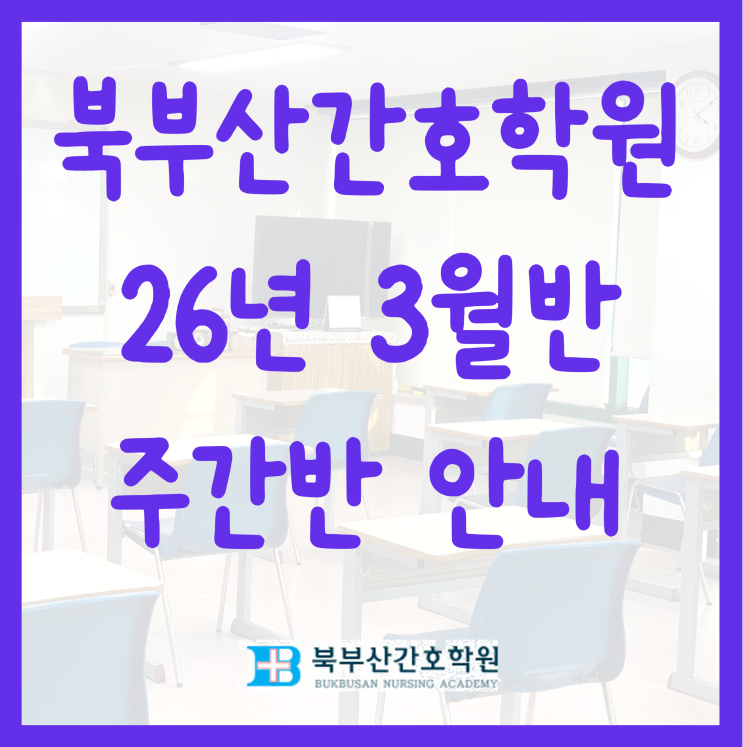 안녕하세요 북부산간호학원 입니다~ ★주간반★ 개강 2026년 03월 개강 국민내일배움카드 과정(국비과정) 2027년 3월에 국가고시 응시하는 반 ★지금 수강신청 가능★ 훈련기간: 2026. 03. 12 (목) ~ 2027. 03. 04 (목) 12개월(1년) 교육일정: 이론과 실습 기간, 시간 등을 꼭 확인해주세요! 이론기간은 학원에서 이론수업을 듣는 기간 실습기간은 병원에 실습을 가는 기간 입니다~ 수강료: 748,600원 (본인의 훈련유형, 훈련이력에 따라 수강료 상이할 수 있음) 분납결제도 가능합니다 분납결제란? 개강 전에 학원에 오셔서 10만원 정도를 먼저 결제 한 후 나머지 금액에 대해서는 훈련기간 동안 한달에 한번씩 나눠 결제 하는 것을 말합니다~ ★....... <img src="https://blogthumb.pstatic.net/MjAyNTEyMThfMzUg/MDAxNzY2MDM4NzcwMjY3.LtXiCRQ6Ob-pQcI7rFe2xWbv_m6Jrw9BNAWTIARrPhMg.PVWXdz6liWQwDvNKuZI3URO8UuKCici9bLAToi0UXdMg.PNG/%B1%D7%B8%B21.png?type=s3" />
