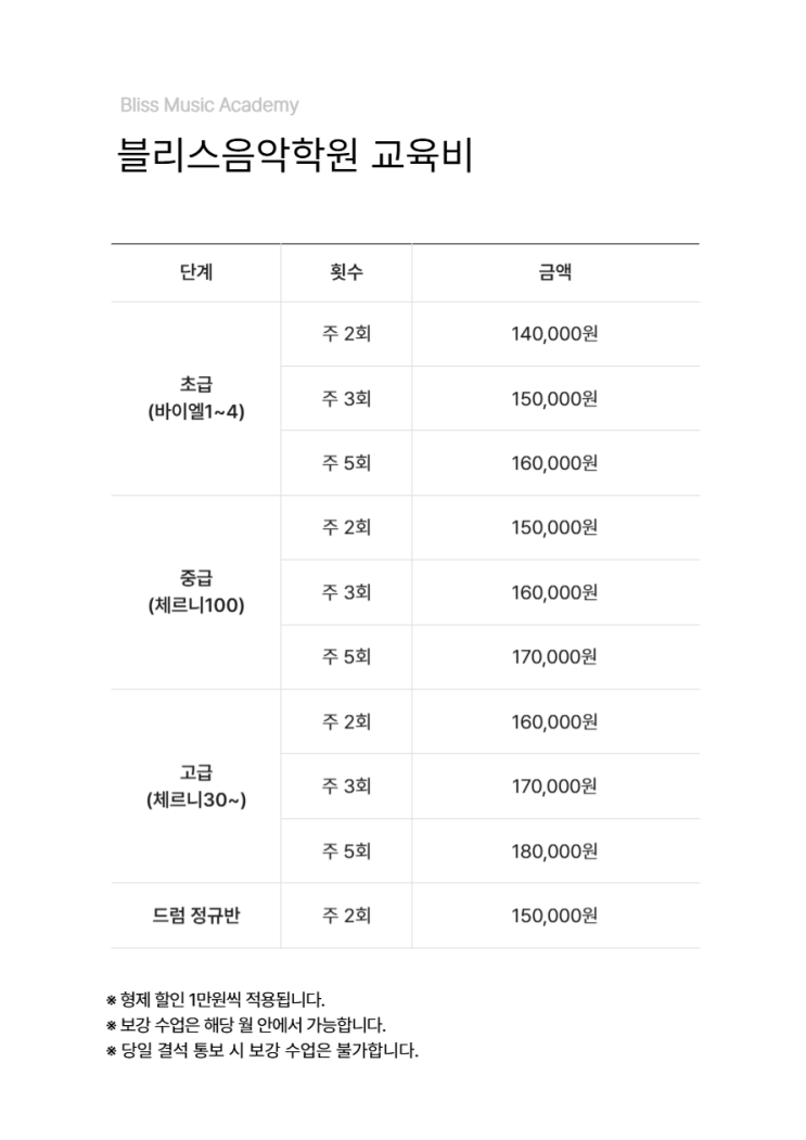 명지 음악학원 피아노학원 블리스음악학원 교육비 안내드립니다. <img src="https://blogthumb.pstatic.net/MjAyNTEyMDNfNDYg/MDAxNzY0NzMwMTQzOTAx.6vF09nmepdnKjP390FwTy7b_I68nPflnq_KzcH8wakAg.vfXL1D9D3-JIzZ5A62A3_e86NUUX8Jkcjrta6sDsIeAg.PNG/%B1%B3%C0%B0%BA%F1-001_%285%29.png?type=s3" />