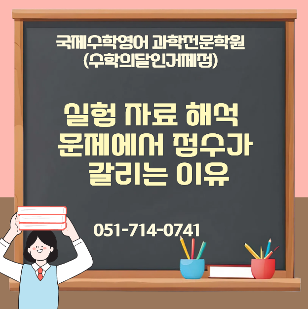 안녕하세요 국제수학영어과학전문학원 (수학의달인거제점)입니다. 저희 학원은 거제동을 중심으로 온천동, 사직동, 내성동 지역 중·고등학생들의 과학 내신과 입시 과목을 체계적으로 관리하고 있습니다. 사직동과학학원 상담에서 가장 많이 나오는 질문 중 하나가 “개념은 아는데 왜 점수가 안 나올까요?” 입니다. 그 원인은 대부분 실험 자료 해석 문제에서 점수가 갈리기 때문입니다. 실험 자료 해석 문제는 ‘공식을 아느냐’보다 ‘자료에서 의미를 뽑아낼 수 있느냐’를 묻는 문제입니다. 축의 의미, 변화 추이, 조건 간의 관계를 빠르게 파악하지 못하면 정답과 멀어질 수밖에 없습니다. 국제수학영어과학전문학원에서는 부산중앙여고 출....... <img src="https://blogthumb.pstatic.net/MjAyNjAxMDZfNTYg/MDAxNzY3NjgwOTc2NTMw.4In_Xx47azIhrncW2WPeUUm9Nk5ix5Bj_zaYMcvnVkQg.8vGZWPJE8g0SQ67Ob65yRql2aIUmd7pE06nWECLmsxcg.PNG/image.png?type=s3" />