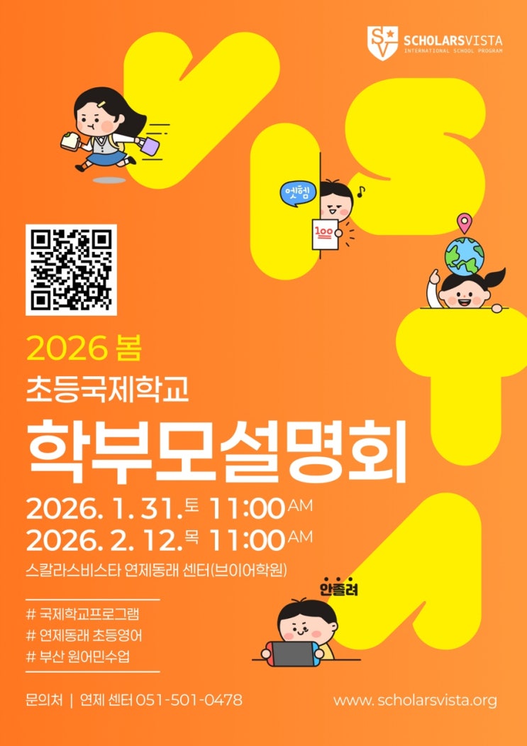 안녕하세요! 브이어학원 원장 비키입니다.^^ 저희 원에서 이번에 야심차게 준비한 프로그램을 소개드리려고 합니다. 바로 국제학교 정규 프로그램 (스칼라스비스타)인데요. 미국초등학교 졸업장도 나온다고 합니다^^ 좀 자세하게 알아볼까요? 실제 서울 캠퍼스 2곳, 부산 캠퍼스를 실제 운영 중이며 이번에 방과 후 프로그램으로 영미권 원어민이 화상 수업을 통해 English, Math, Society, Science 네과목을 진행합니다. 스칼라스비스타에서는 영어가 목표가 아니라 교과목을 배우는 도구로서 영어를 활용할 수 있도록 지도하고 있습니다. <대상> 영유 이후 영어환경에 노출이 필요한 학생 영어로 교과목 수업을....... <img src="https://blogthumb.pstatic.net/MjAyNjAxMTVfMTEx/MDAxNzY4NDgwMzI4NzEz.Z333KDvjHGjHvbVw9jSJD_WDsiPWLliE-p149KzY4Swg.ahW6A5okY0XRRKYF9A_y5OV5kioajJ_fk4HbYOo0dYcg.JPEG/IMG%A3%DF9940.jpg?type=s3" />