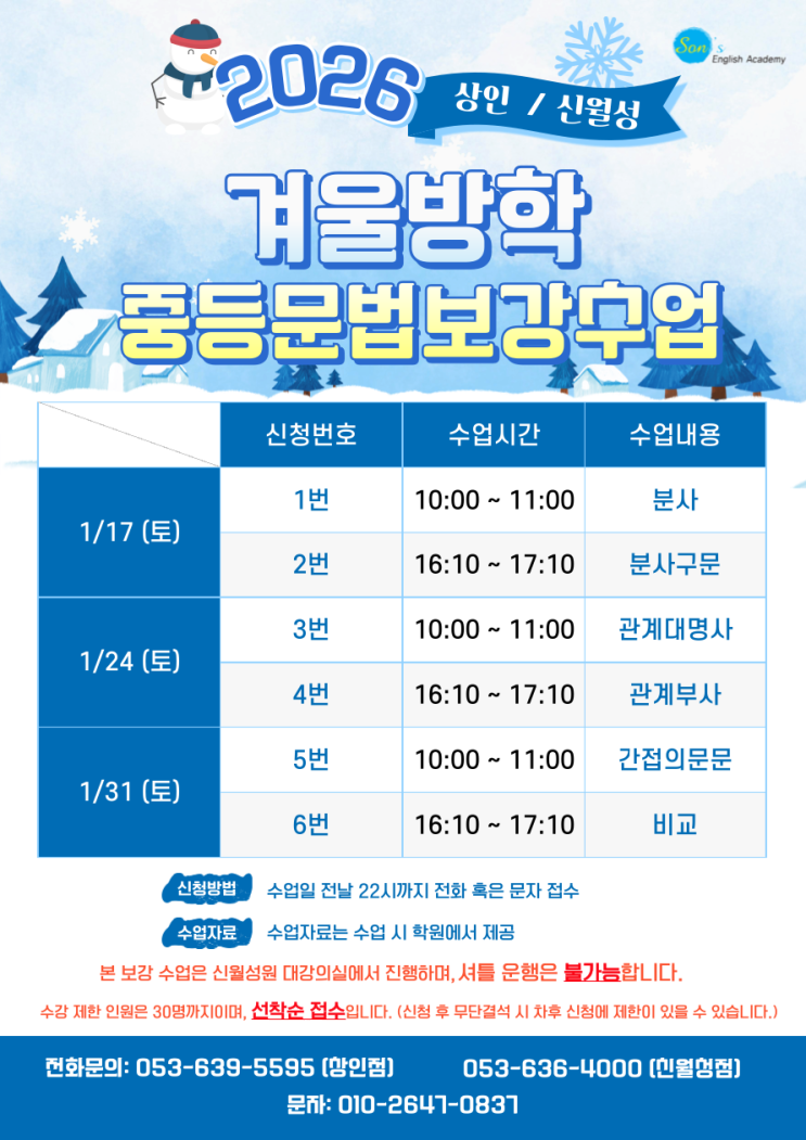 겨울방학, 문법이 성적을 좌우합니다 손샘영어 중등 문법 집중 겨울특강 개강! 안녕하세요, 손샘영어입니다 겨울방학을 맞아 중등 문법 실력을 탄탄하게 다질 수 있는 보강 특강을 개강합니다! 1월 동안 매주 토요일, 중학생(재원생)들에게 꼭 필요한 문법 중심 수업들이 다양하게 준비되어 있으니 아래 내용을 꼭 확인해 주세요. 수업 일정 1월 매주 토요일 ⏰ 신청 기한 수업일 전날 밤 10시(22시)까지 (개인사정으로 등원이 어려운 경우, 사전에 반드시 연락부탁드립니다!) 수업 장소 손샘영어 신월성원 대강의실 대구 달서구 조암로 39, 6층 신청 방법 ① 전화 신청 상인원 : 053-639-5595 신월성원 : 053-636-4000....... <img src="https://blogthumb.pstatic.net/MjAyNjAxMTVfNiAg/MDAxNzY4NDUyNjQ1MzIy.neAxEa0tju3RwkSJdGpcohNvmb-5F6h1FlhE5vhHP8og.aR09rt5C8SqieQ_noSMrl8MDv-EXQUnP0om2OUMv3IEg.PNG/%B0%DC%BF%EF%B9%E6%C7%D0_%B9%AB%B7%E1%BA%B8%B0%AD%BC%F6%BE%F7_%28%C3%D6%C1%BE%29.png?type=s3" />