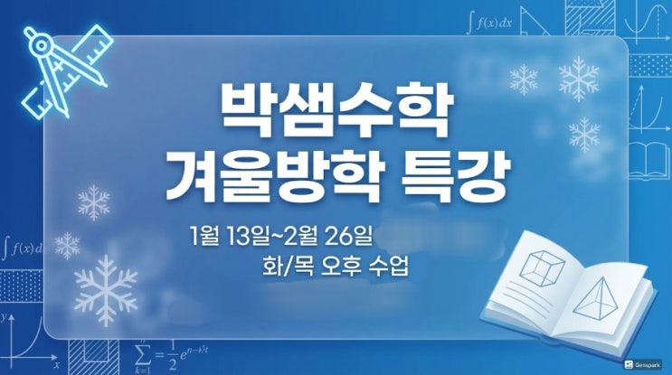긴 겨울방학, 아이의 실력을 키울 수 있는 가장 좋은 시기 신월성 월성동 박샘수학 겨울방학 특강 안내 안녕하십니까. 신월성 월성동 박샘수학입니다~ 긴 겨울방학이 시작되었습니다. 학기 중에는 바쁜 일정 때문에 “알고는 있지만 제대로 정리하지 못한 개념”, “자꾸 헷갈리는 유형”들이 그대로 남아 있는 경우가 많습니다. 방학은 그것들을 바로잡을 수 있는 유일한 시간입니다. 그냥 흘러가 버리면 아쉬운 시간, 조금만 방향을 잡아주면 학기 중보다 훨씬 큰 성장을 만들 수 있는 시간입니다. 그래서 월성동 박샘수학에서는 이번 겨울방학을 의미 있는 실력 상승의 시간으로 만들기 위해 겨울방학 특강을 준비했습니다. 겨울방학 특....... <img src="https://blogthumb.pstatic.net/MjAyNjAxMTZfMjAx/MDAxNzY4NDk0NDM3NjA3.WtT1PGA_sD5GRjldhHbdVrRg8Zp5f9p07ETY3YsFXPkg.ZI9RRBZUu3jcTHBktBOpsGjfYFjscbyAc0KgoaFU0V0g.JPEG/900%A3%DF1765995505697.jpeg?type=s3" />