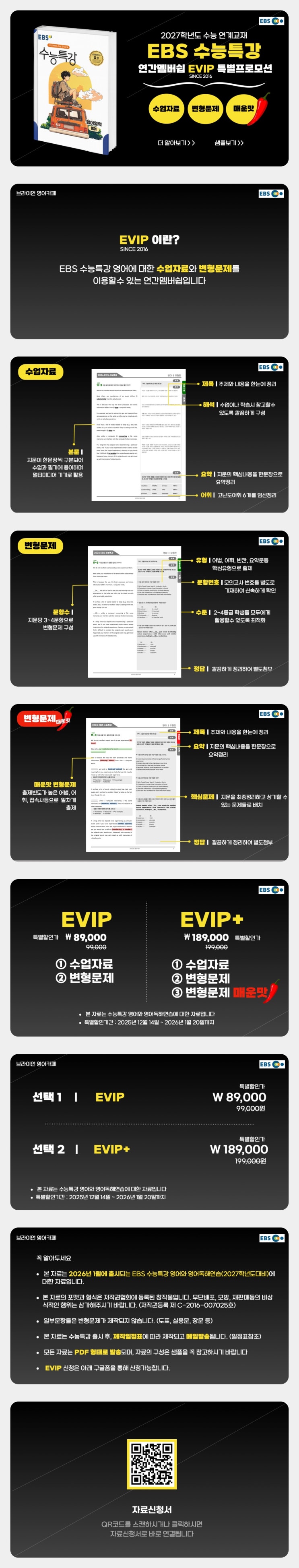 안녕하세요 원장 브라이언입니다. 곧 1월이 되면 EBS 연계교재인 수능특강 영어와 영어독해연습, 그리고 수능완성이 출시가 될 예정입니다. EBS 수능특강은 수능연계교재이면서도, 전국의 모든 고3들이 1학기 내신대비로 사용되는 교재입니다. 하지만 수업자료나 변형문제등 자료가 항상 부족한 게 사실이죠. 저는 2016년부터 수능특강 변형문제를 제작해오면서 전국의 영어강사와 학생들에게 큰 호응을 받아왔습니다. 2026년에는 개정된 디자인과 레이아웃을 통해 더욱더 세련되고 깔끔한 자료로 인사드리게 되었습니다. 변형문제뿐아니라 변형문제 매운맛 버전까지 출시가 되므로, 1학기 내신대비에 큰 도움이 될거라고 믿습니다. EBS 수능특강....... <img src="https://blogthumb.pstatic.net/MjAyNTEyMTVfMjI1/MDAxNzY1Nzc5MjEzMzY3.hI0E6ySANC2iMFiAOP5q0NYbZjgaSGBMtiGG0lfMW6Eg.XrZmo4OByd6BnPRikbJk4dm3fPYo65np3yz38Oa4oQQg.JPEG/%C8%AB%BA%B8_EVIP.jpg?type=s3" />