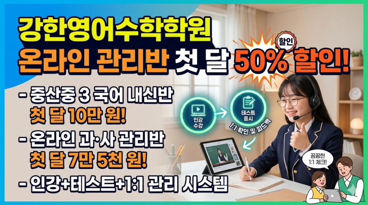 "사실 처음엔 저희도 온라인 관리가 가능할까 의심했습니다." 와서 온라인으로 인강을 듣고 학습을 하는게 집중에 문제가 되지 않을까?? 화면 너머로 딴짓을 하진 않을까? 학부모님들이 하시는 걱정, 교육 전문가인 저희도 똑같이 했습니다. 하지만 지난 [운영 기간] 동안 아이들의 변화를 지켜보며 그 의심은 확신으로 바뀌었습니다. 2. 본론: '강한영어수학'만의 4단계 선순환 시스템 단순히 학습을 체크하는 '감시'가 아닙니다. 아이들이 스스로 움직이게 만드는 매니징 시스템이 핵심입니다. Step 1. 자기주도 학습: 정해진 시간에 등원하여 본인의 학습 범위 인강을 듣습니다. Step 2. 밀착 학습관리: 전문 관....... <img src="https://blogthumb.pstatic.net/MjAyNjAzMjZfMTkg/MDAxNzc0NTE4MDk2OTQz.-VqFFD_TEYbiStEQ-L0T4fbQzv88Y5xajbkr47lCEdYg.EwMcC14BeL7r5laiLIFWTbj9H-S-geV0JbjqljrU4K8g.PNG/Gemini_Generated_Image_henp29henp29henp.png?type=s3" />