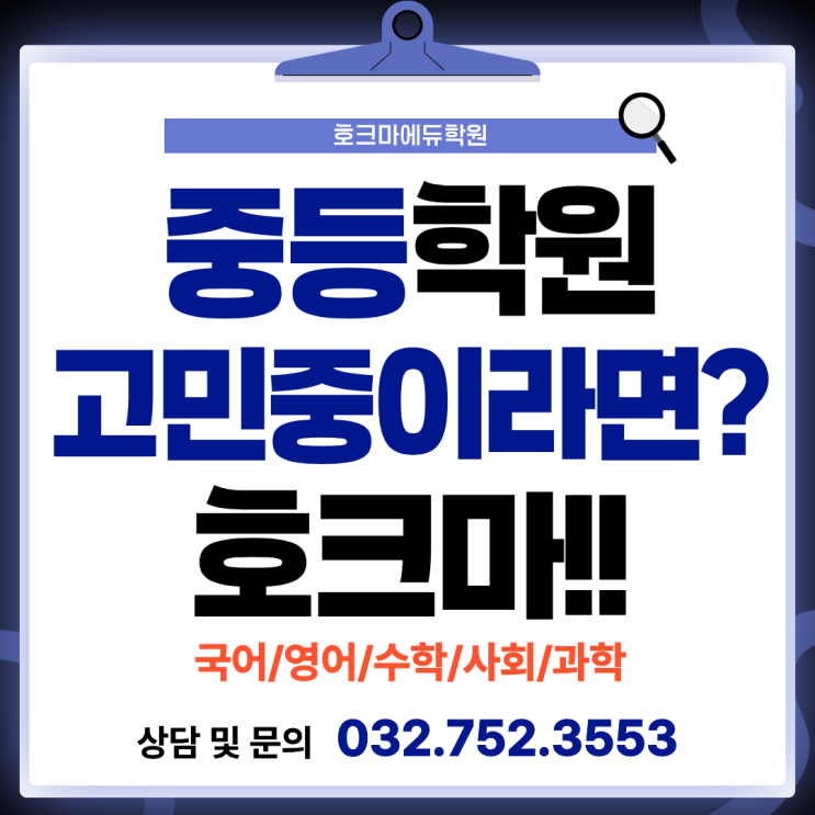 안녕하세요. 호크마에듀학원입니다. 많은 학부모님께서 '아직 중학생이니 괜찮겠지'라고 생각하시는데, 이 생각이 아이의 성적을 가로막는 가장 큰 이유가 됩니다. 중학교 시기는 단순히 시험을 보는 시기가 아니라 공부하는 방법과 습관이 완전히 자리잡는 시기입니다. ✔중1에서는 아이가 어떤 방식으로 공부하는지가 결정되고, 그 습관은 생각보다 오래 갑니다. ✔중2가 되면 같은 시간을 공부해도 성적 차이가 벌어지기 시작합니다. 이미 기본이 잡힌 아이와 그렇지 않은 아이의 차이가 눈에 보이기 시작합니다. ✔그리고 중3이 되면 성적은 더 이상 쉽게 바뀌지 않습니다. 상위권은 유지되고, 중위권은 쉽게 올라가지 못하는 ‘고....... <img src="https://blogthumb.pstatic.net/MjAyNjAzMzFfNTkg/MDAxNzc0OTM5MjYyNjk1.QhJDBrKQoeRkwnzprvW4BlhrRfPFGIm5OjWPZ5-OOO8g.E2h_5ANbGK9Pzx-arTSIrNTkwh4_AxQcXdtTYTvtpGwg.PNG/%C1%A6%B8%F1%C0%BB_%C0%D4%B7%C2%C7%D8%C1%D6%BC%BC%BF%E4._%2828%29.png?type=s3" />