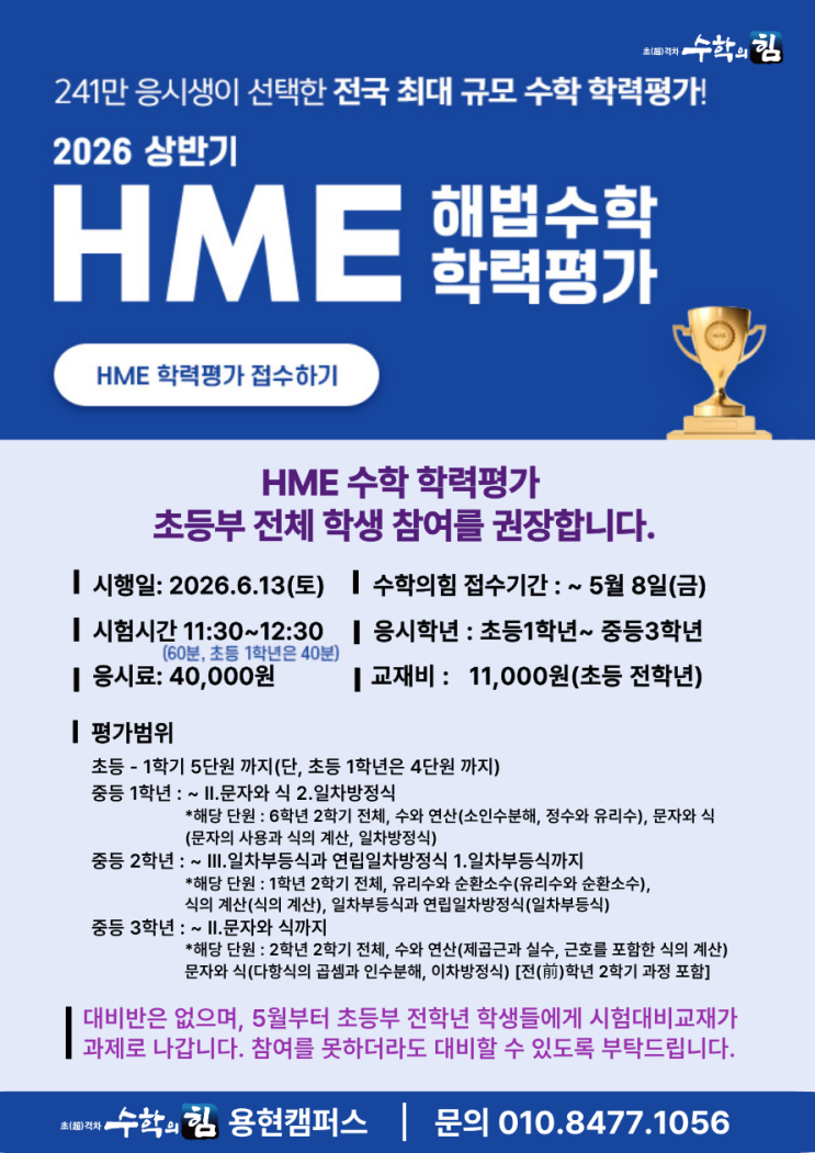 안녕하세요 수학의힘 용현캠퍼스입니다:) 매년 많은 학생들이 참여하는 HME 학력평가는 현재 실력을 객관적으로 진단하고, 앞으로의 학습 방향까지 잡을 수 있도록 도와주는 중요한 시험입니다. 특히 초등부터 중등까지 이어지는 수학 학습 과정에서 지금의 실력을 점검하는 것은 매우 중요합니다. 기초가 탄탄해야 이후 과정에서도 흔들리지 않기 때문입니다. 드디어 올해도 2026 상반기 HME 학력평가가 다가왔습니다. 그래서 지금부터 시험 관련 주요사항을 정리해드리겠습니다:) 시험 일정 및 기본 정보 시행일: 2026년 6월 13일 (토) 시험시간: 11:30 ~ 12:30 (초등 1학년은 40분) 응시 대상: 초등 1학년 ~ 중등 3학년 응시료: 40,000원 교재....... <img src="https://blogthumb.pstatic.net/MjAyNjA0MDRfMzIg/MDAxNzc1MjY2NTM1NTY5.UPhIQs_GCCxULM-b4tkubXKy9tuSXxlrQ2J-Qx7oc08g.Sgq0Wz5DSjq3tYYCJ4Gx9arQL4V4q4NNzeo9Y8-St3Ug.PNG/2026_%BB%F3%B9%DD%B1%E2_HME.png?type=s3" />
