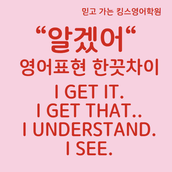 "믿고 가는 킹스영어학원입니다" I get it! 이 표현은 상황에 따라 전달이 달라져요. 목소리 톤을 구별해서 말해야 되요. 유레카! (무언가를 깨달았을 때) "아하! 이제야 알겠다! (감 잡았어!)"는 생각이 들었을때 , 헷갈린던 문제를 풀었거나 상대방의 농담의 뜻을 뒤늦게 이해했을때 , 헷갈리던 문제를 풀었거나, 농담의 뜻을 뒤늦게 이해했을 때 눈을 반짝이며 I got it!이라고 말합니다. 짜증 났을 때 (잔소리 그만!) "아, 알았다고요! (그니까 그만 좀 말해!)" 엄마가 방 치우라고 3번 연속 말씀하시거나, 친구가 같은 말을 계속 반복할 때 약간 짜증을 섞어서 사용할 수 있어요. I get that. 너가 하는 말은....... <img src="https://blogthumb.pstatic.net/MjAyNjA0MDVfMTAy/MDAxNzc1MzU3MDY2NTE3.OXJmb-0qdmJm7w8C126srxXzyf1NAAMTfxRCO3M4hfIg.r-2rrAEjUY83XngppSR-uo-MadDUuncCsMaCAW6KE-kg.PNG/%BD%BA%C5%A9%B8%B0%BC%A6_2026-04-05_114350.png?type=s3" />