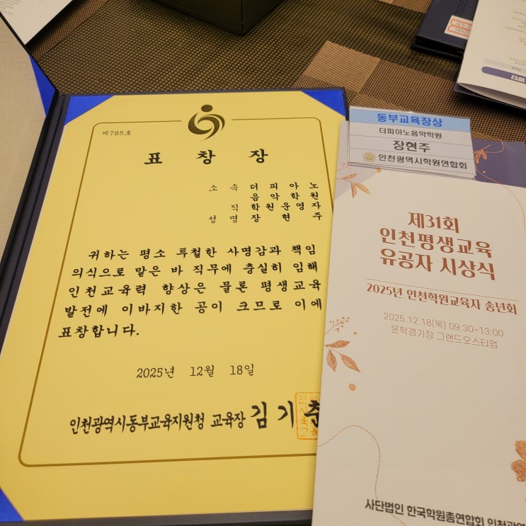 안녕하세요 더피아노입니다~ 한해가 벌써 마무리되어 12월 마지막 달이 되었습니다! 감기조심하시고 2025년 마무리 잘 하시길 바라겠습니다~~ 저희 더피아노음악학원 원장님께서 인천 동부교육청 교육장상을 수상하시게 되어 2025년을 기분좋고 행복하게 마무리하게 되었습니다^^ 더욱 더 열심히 하라는 뜻으로 생각하며 최선을 다하는 더피아노음악학원이 되겠습니다!! 항상 감사드립니다♥ *더피아노 학원은 인천 남동구 서창동 2지구에 위치해있으며, 주소는 인천시 남동구 서창동 691-1 세영프라자 3층입니다 :) <더피아노 오픈 시간> 평일 오전 11시 ~ 오후 9시 (회원 연습실 오후 1시 ~ 오후 9시) 토요일 문의 (평균 오전 9시 ~ 오후....... <img src="https://blogthumb.pstatic.net/MjAyNTEyMThfMSAg/MDAxNzY2MDM1MTcyNzQy.9X__r_mGNfcyBI1i1kg-NdM2DqVZ6Nnc8j4C22FCC70g.T17fL9ZSI6tRRAsQwCt3LUnHftJuQY2tZTlOCSzv9iEg.JPEG/KakaoTalk_20251218_133122862.jpg?type=s3" />
