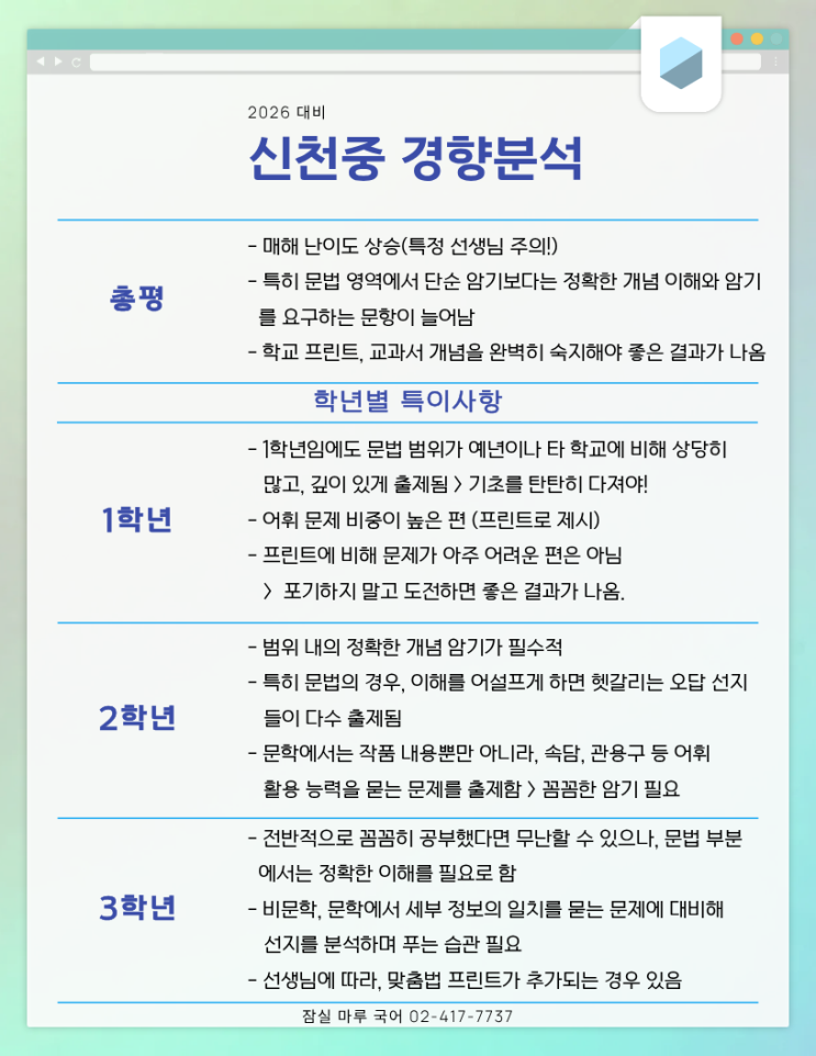 안녕하세요. 잠실 마루국어학원입니다 새 학기까지 이제 한 달도 채 남지 않았습니다.. 2026학년도 내신 대비를 본격적으로 시작해야 할 시기인데요. 특히 국어 과목은 학교별 출제 경향 차이가 매우 크기 때문에, 막연한 문제풀이보다는 학교 맞춤형 분석이 무엇보다 중요합니다. 이번 글에서는 신천중, 잠실중, 잠신중, 정신여중, 아주중, 선화예중 총 6개 중학교의 최근 국어 내신 출제 경향을 직접 분석하여 정리해보았습니다! 잠실 마루국어학원은 잠실권 고등학교별 국어 내신 기출과 출제 경향을 지속적으로 분석하며 데이터를 축적해 왔습니다. 이를 바탕으로 학생이 재학 중인 학교의 시험 방향에 맞춰 수업 내용을 조정하고, 불필....... <img src="https://blogthumb.pstatic.net/MjAyNjAyMTBfMjIw/MDAxNzcwNzA0MDcwNTAy.HccetoL3rgKriaZzgcJgvQ5MxOJZjaVpyV7YrFzErgkg.NKEP2QF2-J5m2Hvs-gn5637__6BMOQeVD8XFEBACFtsg.PNG/KakaoTalk_20260208_211348519.png?type=s3" />
