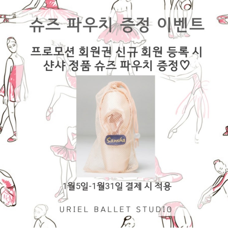 유리엘 발레 스튜디오 광화문,을지로점 26년 신년 맞이 굿즈 이벤트 진행합니다! 1월5일-1월31일 내 회원권 결제 하신 회원분들께 샨샤 정품 슈즈 케이스 드립니다 (원데이 쿠폰 제외) 결제 후 혹여 못 받으신 분들은 원장 선생님께 말씀부탁드립니다! 병오년 신년에도 발레로 건강하고 품격있는 바디 가꾸어 나가요 춤의 낙원,유리엘 발레. <img src="https://blogthumb.pstatic.net/MjAyNjAxMDZfMTk1/MDAxNzY3NjgzOTgwNTAx.w3m-hXw5pRuuFyShF12iO1ELnhBY8nycEWhg307xpmgg.XvvwOp9kCKxlEId3KBqZ0zq79b_fB-fFxGhiyrkt3Pcg.JPEG/900%A3%DFScreenshot%A3%DF20260105%A3%DF112002%A3%DFHancom_Office_Viewer.jpg?type=s3" />