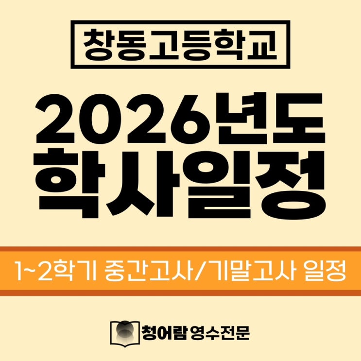 창동고등학교 2026년 학사일정(시험일정) 참고하세요! [정기고사 일정] 1학기 중간고사 : 4/24(금) ~ 4/30(목) 1학기 기말고사 : 6/29(월) ~ 7/3(금) 2학기 중간고사 : 10/7(수) ~ 10/14(수) 2학기 기말고사(1,2학년) : 12/16(수) ~ 12/22(화) 2학기 졸업고사(3학년) : 11/24(화) ~ 11/30(월) 추가로 2027학년도 전국모의고사 일정 참고는 아래 게시물로!! 수험생 여러분 올해도 열공빡공합시다 우리!! https://m.blog.naver.com/chung_eo_ram/224128108018 <img src="https://blogthumb.pstatic.net/MjAyNjAyMjZfMTg2/MDAxNzcyMDk5ODAxMTAx.dlLFE3sr0el_rCem8FhWJo8tvmHS-RdrVZ8hQev4Picg.tW9Ql8KWIUfVSGNr3G6bVe3dobiSn4WtD9l1SlJwMBIg.JPEG/IMG%A3%DF0487.JPG?type=s3" />