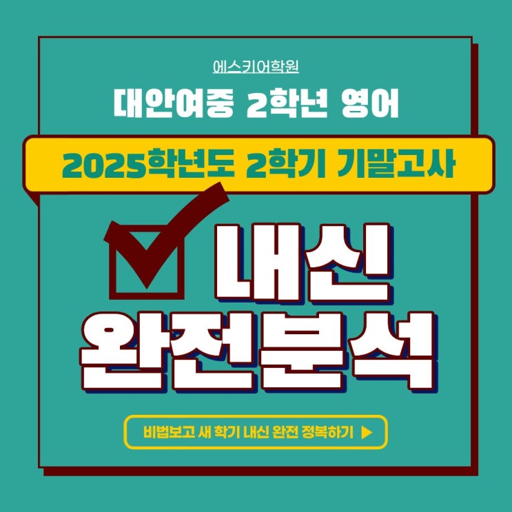 안녕하세요~ 초, 중, 고 연계교육 21년 최고의 변화와 기회를 만드는 건강한 사람들의 건강한 교육 두드림 대안여중 영어학원 에스키어학원입니다. 지난 2학기 기말고사는 학기 초부터 이어진 학습 방향이 내신 성적으로 어떻게 연결되는지를 확인할 수 있었던 시험이었습니다. 귀인·범계·덕장·백운, 대안여·갈뫼·호계중 등 여러 학교에서 확인된 영어 만점과 고득점 사례는 에스키 입시영어만의 특별함! 학교별 출제 흐름에 맞춘 내신 전략이 제대로 작동하고 있음을 다시 한번 증명해 주었는데요. 새 학기를 약 한 달 정도 앞둔 지금, 중요한 것은 결과보다 왜 이런 결과가 나왔는지를 정확히 짚어보는 일이기에 그래서 오늘은 2025년 2학기 기....... <img src="https://blogthumb.pstatic.net/MjAyNjAyMDZfMjY0/MDAxNzcwMzY1NTg1OTI1.ocNyjfFhlgsfq4dcILyFU9oDqcYZSDw8BICkXHVBCJkg.DpzDiTw7bVqWwNxSnsLo23-TOQzer2oKQgr7muY-SLgg.JPEG/1.jpg?type=s3" />