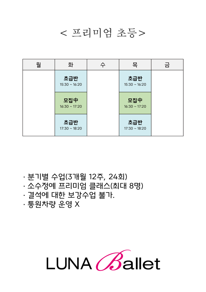 추가 클라스 문의 (수강생 4명이상 시 개설가능) 루나발레 프리미엄 초등반은 분기별 3개월 단위, 소수정예(최대8명)로 총 12주-24회수업으로 진행합니다. 프리미엄 초등반 봄분기 (3~5월) ★ 상담문의 ★ (방문상담은 반드시 예약 후 방문해주세요.) 카카오톡 채널 : lunaballet 전화 : 031.796.1256 <img src="https://blogthumb.pstatic.net/MjAyNjAyMTBfMjM0/MDAxNzcwNzA4Nzk0NDEx.TGlvUke11Movxo1Yat3D3NhqWdKhd14mjutaeY1mVX4g.O84tideNLNJMK_iJ4RwBma0IENjs8MPl1j418ku-lGgg.PNG/%B7%E7%B3%AA%B9%DF%B7%B9_%C0%AF%BE%C6%C3%CA%B5%EE_%BD%C3%B0%A3%C7%A5%28%B1%E2%B0%A3%BE%F8%C0%BD%29_25.12_A4.png?type=s3" />