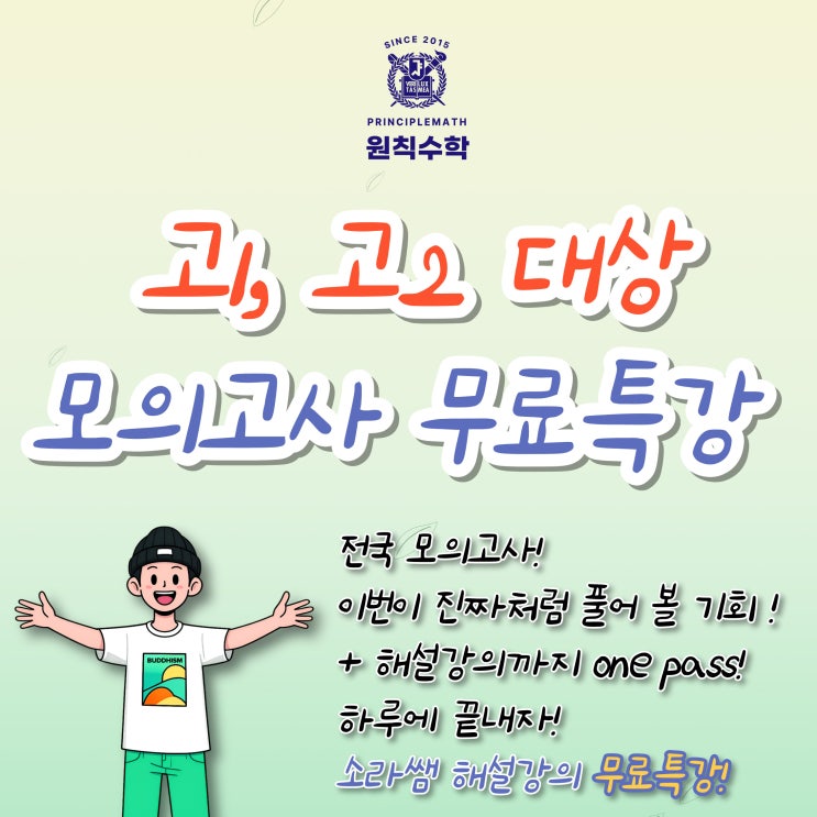 안녕하세요. 미사 중고등 수학전문학원, 원칙수학입니다. 3월 16일, 3월 23일 각각 1일 무료 특강이 있습니다! 수학과 출신 김소라 선생님의 모의고사 해설강의를 들을 수 있는 기회입니다. 고1 학생과 고2 학생이라면 원칙수학 수강생이 아니더라도 무료특강에 참여할 수 있습니다. 지난 연합학력평가를 실전처럼 풀어보고 시험 본 직후 곧바로 해설강의를 들을 수 있어 학생들에게 큰 도움이 될 것으로 예상됩니다. 카카오톡 채널 '원칙수학' 검색 후 아래 양식에 맞게 내용 보내주시면 신청이 가능합니다. 참여일자/학교/학년/소속(재원/타원)/이름/전화번호 예시) 3월 16일, 미강고1학년, 타학원생, 홍길동, 010-1234-9876 ⬇️카....... <img src="https://blogthumb.pstatic.net/MjAyNjAyMjZfMTU1/MDAxNzcyMTEyNjcxODM1.cyIFCHR0Udbl_KCg-IdLzyn5_35YFYZf57i1jyMIiQcg.e3rOb467HHzYUNZA7k_8IgT8F4mjJnIBZWPo6epkHfkg.JPEG/1.jpg?type=s3" />