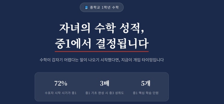 01. 중1 수학, 무엇이 달라지는가 중학교 수학은 초등 수학과 질적으로 다릅니다. ⚠ 수와 연산 / 문자와 식 / 함수는 중·고교 전 과정의 기초입니다. 이 세 영역에서 개념이 흔들리면 이후 보완이 매우 어렵습니다. 02. 효과적인 학습을 위한 4단계 접근법 문제를 많이 푸는 것만이 수학 공부가 아닙니다. 성적이 오르는 학생들에게는 공통된 학습 패턴이 있습니다. 03. 중1 수학에서 자주 발생하는 학습 문제 수업 이해도는 괜찮아 보이는데 시험 성적이 기대에 못 미친다면, 아래 세 가지 패턴을 점검해 보시기 바랍니다. 04. 전문적인 지도가 필요한 이유 자기주도학습이 이상적이지만, 중1은 스스로 학습의 방향을 점검....... <img src="https://blogthumb.pstatic.net/MjAyNjAzMjZfMTYg/MDAxNzc0NTA1NTU4MTcy.vl9k1Xw1gPqBGOD330t16aARmdLFvCgbAx1XUO_9fukg.iOdXgx56_03WUiyFAhwEZlTZTy7IdRm0pnEaodZsuLQg.JPEG/math01.jpg?type=s3" />