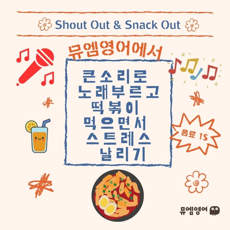 안녕하세요? 뮤엠영어 구성우림점 Ann 원장입니다. 새학기가 시작되면서 우리아이들 한명씩 생각하다가 새로운 교실, 새친구들과 어색하고 힘들어하면 어쩌지? 하는 생각이 스쳐갑니다. 학교에서 친구들과 수다떨며 친구들 만나러 학교가는 재미를 갖게 해주고 싶다는 생각이 들었습니다~ 그래서 준비했습니다. Shout Out & Snack Out 학교 친구들에게 떡볶이를 사주고 음료수도 사주고 좋아하는 노래를 함께 목청껏 부르는 하루! 장소: 뮤엠영어 구성우림점 날짜: 4.3(금) 시간: 6:30 ~ 7:00 7:00 ~7:30 7:30 ~8:00 장소가 협소하고 수업 시간은 줄일 수가 없어서 30분정도 짧은 시간을 해야하는 점 이해 해 주시기 바랍니다. 대상: 뮤엠영....... <img src="https://blogthumb.pstatic.net/MjAyNjAzMjBfMjU0/MDAxNzczOTk3NzA2MzM2.qp9bI6y2QSof5zuAIamte_LFHSFH2lqHeepRfqdj5ocg.fX--EnYzMs1tXDw3j4DYMb2hMZYdEAvpuhPZWVoAjjkg.JPEG/%BA%A3%C0%CC%C1%F6%BB%F6_%C1%D6%C8%B2%BB%F6_%B3%B2%BB%F6%C0%C7_%BD%C9%C7%C3%C7%D1_%B0%A1%B0%D4_%C6%F7%C0%E5_%C7%D2%C0%CE_%C0%CC%BA%A5%C6%AE_%C8%AB%BA%B8_%C0%CE%BD%BA%C5%B8%B1%D7%B7%A5_%C6%F7%BD%BA%C6%AE.jpg?type=s3" />