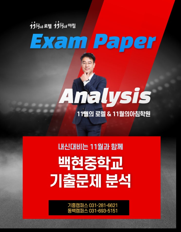 안녕하세요. 용인 기흥구에 위치한 백현중학교 전문학원 동백 11월의로렐학원입니다. 중간고사 내신대비에 앞서 백현중학교 기출 분석이 먼저입니다. 저희 학원은 수학, 영어, 국어, 과학 과목별로 백현중 시험 경향을 꼼꼼히 분석하여 학생 맞춤형 내신 대비를 진행하고 있습니다. 이번 글에서는 백현중학교 2024년 기출문제 분석을 통해 2026년 내신을 더욱 효율적으로 준비하는 방법을 안내해드립니다. 내신은 막연히 공부한다고 오르지 않습니다. 학교별 출제 스타일과 반복되는 핵심 유형을 정확히 파악해야 실질적인 성적 향상으로 이어질 수 있습니다. 백현중학교 시험지 풀버전이 필요하신 학부모님께서는 언제든 동백 11월의로렐학원으....... <img src="https://blogthumb.pstatic.net/MjAyNjAzMjlfMjI1/MDAxNzc0Nzc2MzEzOTY5.SIXsHrMw_N_SKz2HfSs4G8aGo7YjL9cBDpt4zeToIh8g.0HEyAM4DNDVUSA9EoXt6lIoGfX45DVKholzf9UV2ZI4g.JPEG/%B9%E9%C7%F6%C1%DF%B1%E2%C3%E2%BA%D0%BC%AE1.jpg?type=s3" />