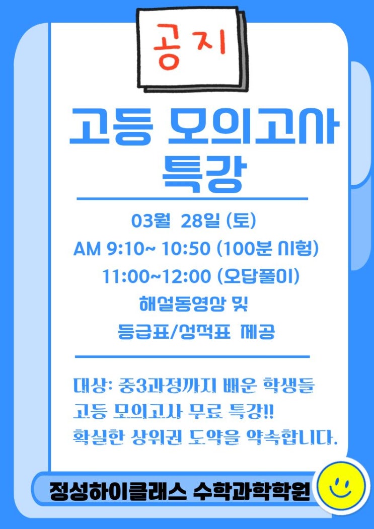 안녕하세요. 죽전 보정 대표 수학과학 학원 정성하이클래스입니다. 2026. 3.24(화) 2026학년도 첫 고등 전국모의고사 "3월 모의고사"가 실시됩니다 !! 고3, 3월 모의고사 시험범위 고2, 3월 모의고사 시험범위 고1, 3월 모의고사 시험범위 새 학년에서 맞이하는 첫 시험인만큼, 죽전 보정 수학과학 학원 정성하이클래스에서는 3모대비 모의테스트를 실시하여 실전 연습을 합니다. 고등부 전학년은 작년까지의 실제 기출문제 및 변형 문제로 모의시험을 보고 등급표 제공은 물론, 정성하이클래스 강사님이 직접 풀이하는 특강 영상까지 제공됩니다! 여러분의 실력을 아낌없이 발휘하길 바래요~ 아울러 정성하이클래스 중등관 특전! 중2,....... <img src="https://blogthumb.pstatic.net/MjAyNjAzMTdfMjI3/MDAxNzczNzQ1ODI1OTA4.vpi-zxaDtBfrcKRMnLgQrcbnw_UkrJWTo9aM3lbX5REg.yxkGOIYUjBERMsa3u0h7fgcBQ9pUwOIVl9vGcFX3hwgg.JPEG/%B8%F0%C0%C7%B0%ED%BB%E7_%C6%AF%B0%AD.jpg?type=s3" />