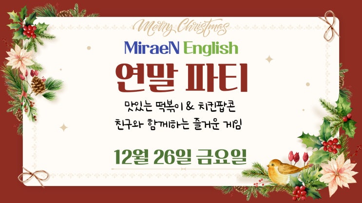 크리스마스가 막 지난 12월 26일, 우리 미래엔영어 친구들과 함께 2025년 마지막 추억을 만드는 시간을 가졌습니다. 한 해 동안 열심히 공부한 아이들에게 즐거운 보상과 따뜻한 격려를 전하고 싶었고, 우리 친구들도, 선생님도, 모두가 마음껏 웃고 즐길 수 있었던 행복한 하루였답니다. ✨도블 게임 & 키링 만들기 / 볼펜 만들기 – 우리만의 귀여운 선물 저학년 친구들과는 시끌벅적한 도블 게임으로 분위기를 먼저 띄운 후, 세상에 단 하나뿐인 키링 만들기를 했어요. 색색의 비즈와 리본, 귀여운 팬던트를 고르는 아이들 눈빛이 반짝반짝 빛났습니다. “이건 엄마 드릴 거예요!” “이건 제 가방에 달 거예요~” 아이들의 순수한 마음이....... <img src="https://blogthumb.pstatic.net/MjAyNTEyMjlfMTk5/MDAxNzY2OTg0OTYwNjEz.C_iHNWXE0wgH5REHZ9NGssJd3RJHIbF5d6PyxYmLQQYg.BHInVsMIH9DLTwHjBDFNwYkL-99ciEkUdNdWELddqkIg.JPEG/%BF%AC%B8%BB%C6%C4%C6%BC.jpg?type=s3" />