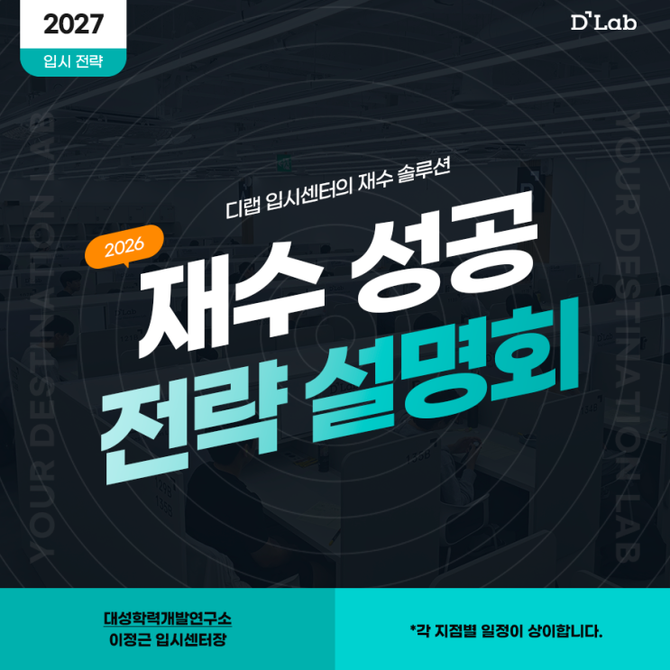 안녕하세요. 대성학원이 만든 독학재수학원, 디랩입니다. 재수를 선택한 순간, 많은 학생들은 같은 고민에 부딪히게 됩니다. 이번에는 정말 달라질 수 있을까? 2027 대입 준비에 들어선 현재, 입시 환경은 더욱 복잡해졌고 단순히 공부량을 늘리는 방식만으로는 한계가 분명히 존재합니다. 재수의 결과를 좌우하는 것은 결국 변화한 입시 흐름을 얼마나 정확히 이해하고, 그에 맞는 학습 관리 전략을 끝까지 실행할 수 있는지입니다. 재수에 대해 고민이 많은 학생들을 위해 디랩에서는 이정근 입시센터장님과 지점별 담임 선생님들이 함께하는 재수 성공 전략 설명회를 준비했습니다. 이번 설명회를 통해 막연한 불안이 아닌 실제 합격 사례로 검....... <img src="https://blogthumb.pstatic.net/MjAyNjAxMDlfMTk3/MDAxNzY3OTM5MTU4NDkx.SwN9JMvbY08VVAKnqzK9q1RgJ3gWSCI4P1MXVTXiYFQg.us9K__Q2E05evdbt1jUrE1J0y_MSXN4NjWqwWFUowgIg.PNG/1%28%C0%E7%BC%F6_%BC%BA%B0%F8_%C0%FC%B7%AB_%BC%B3%B8%ED%C8%B8%29.png?type=s3" />