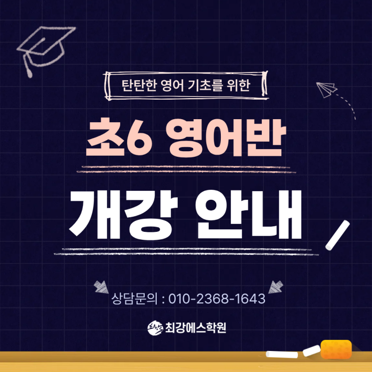 안녕하세요. 최강에스학원입니다 :) 2026년에 새롭게 열리는 초6 영어반에 대한 정보와 수업 진행 일정에 대해 안내해드리도록 하겠습니다! 초6 영어반 수업 안내 초등학교 고학년 시기는 중등 학습으로 나아가기 위한 기초를 다지는 중요한 시기입니다. 미리 기초를 다져놓은 학생이라면, 갑자기 어려워진 수업 난이도에도 빠르게 적응하며 좋은 성적을 거둘 수 있습니다. 저희 최강에스학원은 이번 초6 영어 개별 맞춤식 수업으로 학생 개개인의 수준과 학습 성향을 고려한 수업을 통해, 기초 개념을 탄탄히 정리하고 중등 과정에 철저히 대비할 수 있도록 진행할 예정입니다. ✅초6 영어, 누가 들어야 할까요? - 중등 영어 시험에 미리 대비하....... <img src="https://blogthumb.pstatic.net/MjAyNjAxMTlfMjQz/MDAxNzY4ODE5NTQzNjI1.orJ9DDcHIIBH6gJUeTBG-QvdFcS51T48YmES1isOwWsg.VUMkH0cHERE_9PRpadLDof2dDdhdalk1sCMRPyfZgpcg.PNG/2.png?type=s3" />