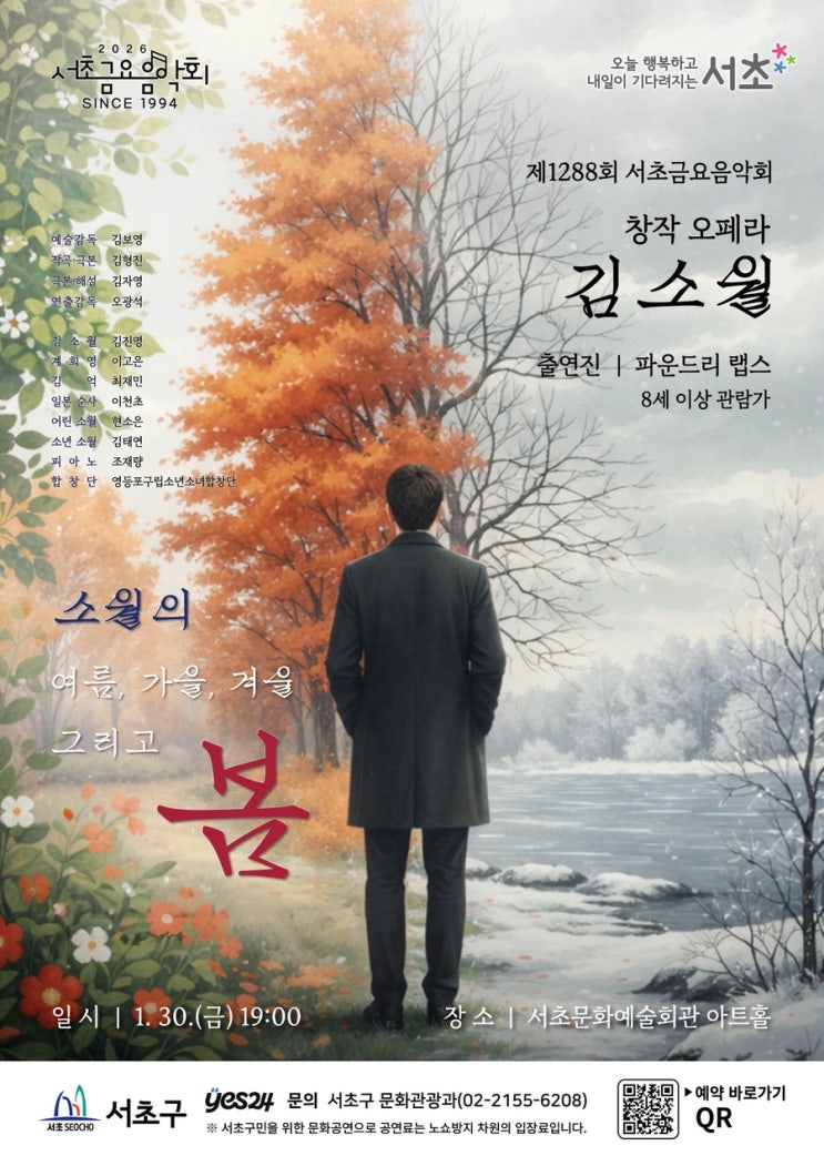 안녕하세요? 경기광주 음악학원 꿈을 연주하는 꿈공간 이음부부원장입니다. 오늘은 너무 기대가 되는 공연이 있어 소개해 드리도록 하겠습니다. 서초 문화예술회관 제1288회 서초 금요음악회 창작 오페라 서초 공연 추천 1순위 "김소월" 소개해 드리도록 하겠습니다. 서초 금요 음악회가 특별한 이유? ✔️ 지금까지 30년 이상 지속된 정기 음악회 ✔️ 전문 연주자와 수준 높은 프로그램으로 구성 일상 속 만나는 고품격 공연 ✔️ 클래식이 어렵지 않게 느껴지는 무대 ✔️ 대부분 무료로 즐기는 문화 복지 ✔️ 금요일 저녁을 특별하게 만들어 주는 시간 ✔️ "생활 속 문화 예술 도시 서초"라는 이미지를 구축 ✔️ 타 지....... <img src="https://blogthumb.pstatic.net/MjAyNjAxMjRfMTQ5/MDAxNzY5MTk2OTgzMzk4.cxSW3yt5xLIFCFMkM26H8yF3J_QJ1qHs_yet6ASXnn0g.3J_JesUkTNHMYWcnrvoOvHdxdVzbNSVKAVL9Lg3S114g.JPEG/IMG%A3%DF0351.JPG?type=s3" />