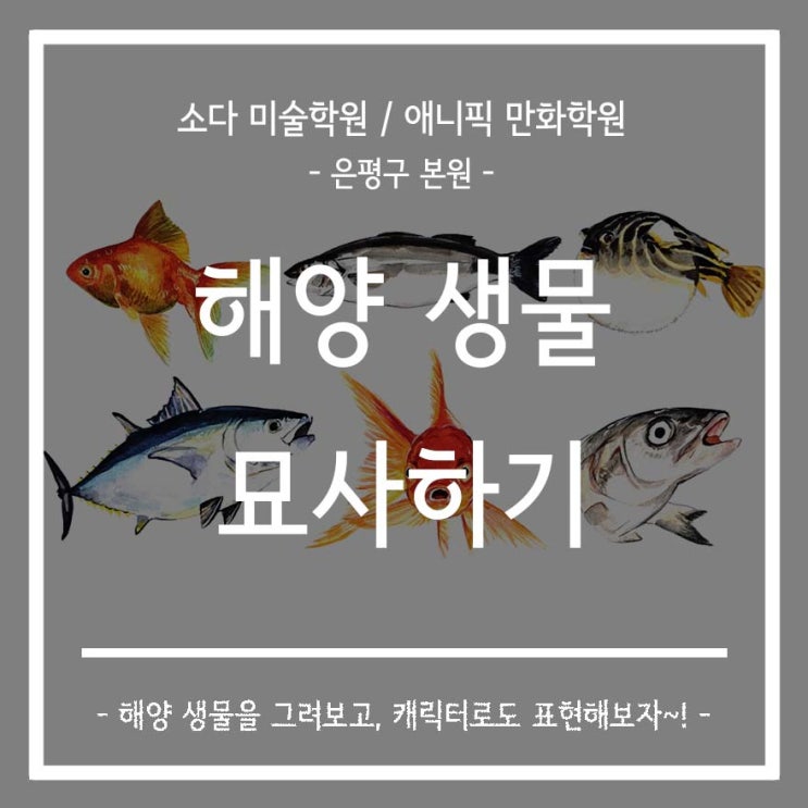 안녕하세요~ 은평구 구산 만화 애니 학원 불광 미술학원 소다 미술학원 / 애니픽 만화 학원입니다! 요즘 부쩍 날이 따뜻해지고 있어요. 오늘은 따뜻하다 못해 날씨가 덥게 느껴지기도 합니다. 최근에 식중독이 유행하니, 음식 드실 때 조심하시기를 바랍니다~ 오늘은 <해양 생물>묘사 수업에 대해 소개해 보려고 합니다. 개체 묘사 수업은 '묘사'가 중심이 되는 수업이지만, 이번 수업의 목표는 약간 차이가 있었습니다. 바로 묘사 후, 데포르메를 넣어 개체를 캐릭터화까지 해보는 수업이었는데요~ 위의 작품들은 수업 시간에 완성한 작품들을 모아놓은 것인데요~ 개체 묘사부터 캐릭터로 바꾸기까지, 다양한 작품들이 많네요. ....... <img src="https://blogthumb.pstatic.net/MjAyNjAyMjVfMTM5/MDAxNzcxOTk3NDk2MzEx.4aPxrGUiszYXVErySZziSvvVVXbo1rK__fex3P29pjgg.Fn1BdmvXxyO9iiiIouMcJDP7YEGKoODjqMma6YNGDhUg.JPEG/0225_%B4%EB%C7%A5%C0%CC%B9%CC%C1%F6.jpg?type=s3" />