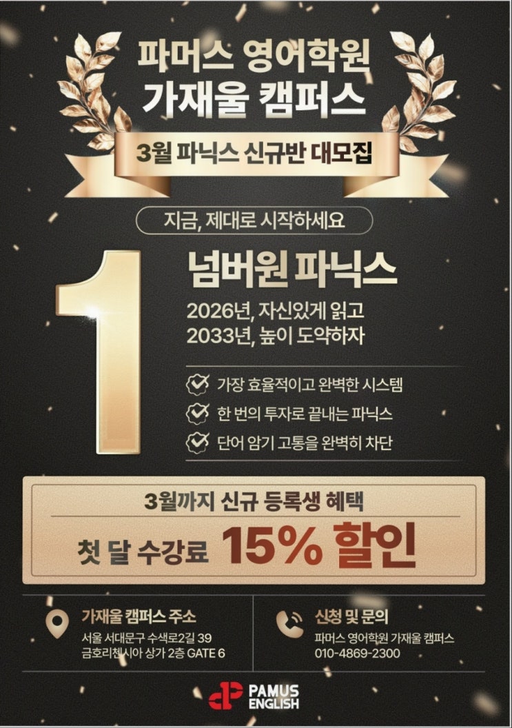 안녕하세요~ 파머스영어 가재울 캠퍼스 입니다~ 2026년 신설 파닉스반이 개강되었습니다~!! 저희 가재울캠퍼스에서는 파닉스반이 신설되었습니다~! ☆2시15분 ~ 3시05분 수업 (3시5분 ~3시40분 코칭) ☆ 4시05분 ~ 4시55분 수업 (4시55분~5시30분 코칭) 알파벳 소리부터 정확하게 잡아 읽기 자신감까지 키워주는 수업입니다~! 바로 지금 ! 영어의 기초를 탄탄하게 시작해주세요!! 지금 등록하시면 수강료 할인의 혜택을 드립니다!! ☆ 영어 읽기의 기본을 완성하는 파닉스 과정 ☆ 기초를 바로 세우는 체계적인 수업 ☆ 처음 배우는 아이도 자신이 생기는 탄탄한 파닉스 파머스 가재울캠퍼스 상담문의 010-4869-2300 <img src="https://blogthumb.pstatic.net/MjAyNjAzMDVfMTQw/MDAxNzcyNzA4MjE0MTAw.yWDOdNsD2R1mxU8m5eq4P9I6AbhDqAFd4nuEBKtrgpog.ztEdqiy_3i6Z3p0tGbw4t3XAZRGEXwzpHunmDBk3PkEg.JPEG/2026.03%C8%AB%BA%B8%C6%F7%BD%BA%C5%CD.jpg?type=s3" />