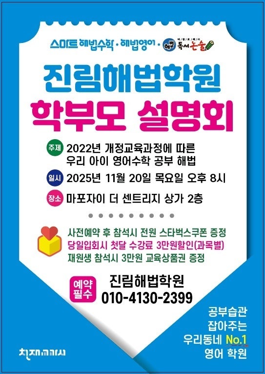 안녕하세요. 영어강의 경력 20년 차 스마트 해법영어 수학 독서논술을 7년째 운영하고 있는 진림해법학원 원장 장민숙입니다. 지난 2025년 11월 20일 목요일 오후 8시, 스마트해법영어수학독서논술 진림해법학원에서 작은 목적 하나를 품고 학부모 설명회를 열었습니다. 바로 "아이들이 앞으로 어떤 힘을 가지고 성장해야 하는가?"라는 교육의 본질에 대해, 부모님들과 진심으로 이야기 나누고 싶었습니다. 아이들의 교육을 위해 누군가 저를 믿고 자리에 와주었다는 건, 7년 동안 이 학원을 운영해오며 느껴온 책임감 가운데서도 가장 크게 마음을 울리는 순간이었습니다. 그 밤, 총 18명의 학부모님들께서 바쁜 일상과 피곤한 시간에....... <img src="https://blogthumb.pstatic.net/MjAyNTEyMDJfMTMg/MDAxNzY0Njc1MTEyOTI5.9LEVmRMvwZYawrJxqotU0ioMQuLhUGp5g4hpPn3YgzIg.GFBrq-MpYklTAre2Z0BJOuDaY20zS6XyyDmtaXYicuAg.JPEG/1763528137914.jpg?type=s3" />
