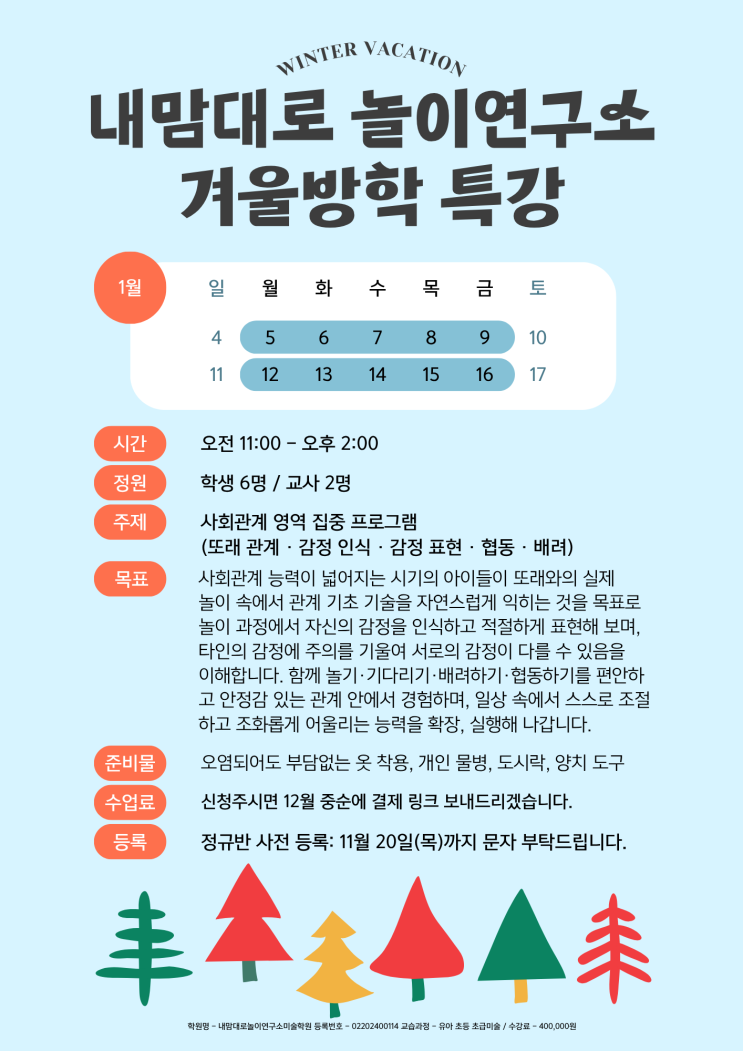 내맘대로 놀이연구소 2025 겨울 방학 특강 관심있으신 분은 010 8104 1233 연락주셨으면 합니다. 감사합니다. <img src="https://blogthumb.pstatic.net/MjAyNTExMjBfNzkg/MDAxNzYzNjE2ODM1OTQ0.b-o-1i-PK_WYyM0fESkfhdYmqmrCRbc5OSmASvm2-Vgg.mBtmvXfAqHXsqMVx-PygdyJaWnACRQz_DMTouqJzq3Yg.PNG/1.png?type=s3" />