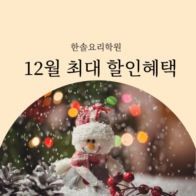 한 해를 마무리하는 12월. 새로운 ☑️취미 ☑️진로 ☑️자격증 준비를 시작하기에 딱 좋은 시기죠. 한솔요리학원에서는 올해 마지막을 맞아 ✅ 최대 40%까지 적용되는 12월 요리학원 이벤트를 진행합니다. 이번 혜택은 ☑️학생☑️직장인☑️입시생☑️취미 등 누구나 필요한 과정에 맞춰 선택할 수 있도록 구성됐어요. 연말에만 받을 수 있는 특별 혜택이라 많은 분들의 문의가 몰리고 있답니다. 오직 12월, 준비된 사람만 누릴 수 있는 혜택 패키지 12월 한 달간 모든 수강생에게 적용되는 혜택이에요. 특히 ✔️학생✔️입시 준비생에게 유용한 구성부터 ✔️일반 정규과정까지 전반적으로 준비되어 있어 선택 폭이 넓은 것이 특징입....... <img src="https://blogthumb.pstatic.net/MjAyNTEyMDRfMjUx/MDAxNzY0ODEwOTU2OTA0.93bsNeM9ZxaVG8D79KfP_VxCHCFXPenczcN5oFNi-QMg.6IvcFZDQWdC3xj7Ox9jtSXyG4EA5OKI_QTck6GSd6nsg.JPEG/%BD%E6%B3%D7%C0%CF.jpg?type=s3" />