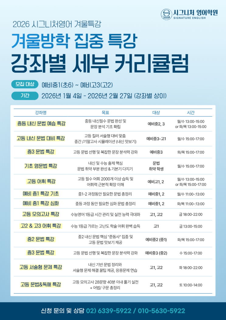 안녕하세요 시그니처 영어학원 원장입니다. 저는 지난 수년간 우리 아이들을 지도하며 영어 실력 향상이 단순 노력만으로는 한계가 있음을 절감했습니다. 물이 끓는 점이 있듯이, 영어도 기초 역량을 충분히 쌓은 후 한순간에 폭발적으로 도약하는 계단식 성장의 과목입니다. 그런데 그 꽉 막힌 듯 정체된 구간을 뚫고 다음 레벨로 올라서는 가장 중요한 시점이 있습니다. 바로 겨울방학입니다. 여름방학보다 확연히 긴 겨울 방학을 잘 활용한다면 아이의 영어 실력을 한번에 끌어올릴 수 있습니다. 학기 중에는 학교 진도와 시험에 쫓기느라 근본적으로 아이의 부족한 부분을 메울 시간이 정말 없습니다. 시그니처 영어학원은 이 중요한 시기를....... <img src="https://blogthumb.pstatic.net/MjAyNTEyMDdfMjEy/MDAxNzY1MTE2ODI4MTIy.bPiyA4aOu5a5u7gKm7oncy8ZPYD4WZDR-M8clAGF5eIg.Wv9mwtO5afQDaLwWw90NO9MzmSeGkkDJHra0eGQe3wIg.PNG/KakaoTalk_Photo_2025-12-07-23-10-26.png?type=s3" />