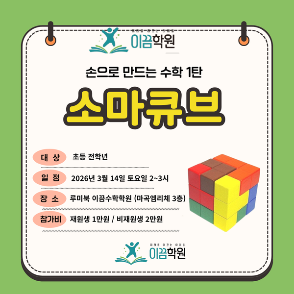 마곡 공진초 루미북클럽 이끔수학학원 『손으로 만드는 수학』 소마큐브 일일특강 소마큐브 란 소마큐브는 7개의 정육면체를 조합해 하나의 큰 정육면체를 또는 다양한 입체 모양을 완성하는 입체 퍼즐 교구 입니다. 단순희 놀이처럼 보이지만, 조각을 돌리고 쌓고, 해체하는 과정 속에서 아이는 공간 감각과 사고력이 자연스럽게 자라납니다. 특히 퍼즐학습에서 얻을 수 있는 집중력과 과제 집착력 인내심과 끈기도 키울 수 있습니다. 소마큐브 학습 효과 소마큐브 학습효과 공간감각과 입체 사고력 향상 문제 해결력과 논리적 사고 집중력과 인내심 수학적 개념의 기초 형성 왜 초등 연령에서 더 효과적일까요? 하나. 손으로 배우는 사고가 가....... <img src="https://blogthumb.pstatic.net/MjAyNjAyMDZfOTYg/MDAxNzcwMzc0Njc4MzA5.4vgrZaIoXooCwjYm2lvQwuqztaQBt702wFZSJemfvXMg.OXPldDF4J4E5ESti_bnrZkyzMMGheJdTk07Vl51zVhAg.PNG/%C3%CA3%B1%B3%B0%FA%BC%F6%C7%D0%B8%F0%C1%FD.png?type=s3" />