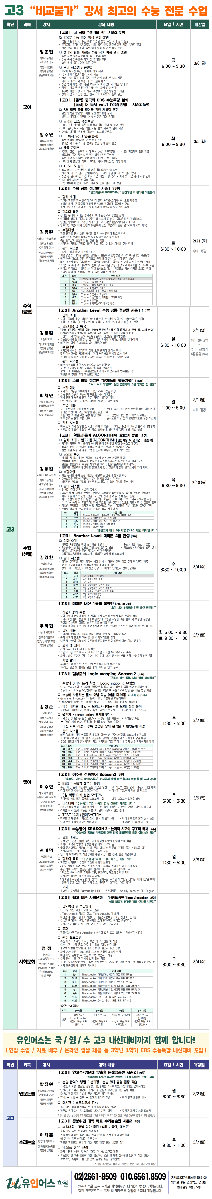 <고3> 3월 개강 시간표 2026 유인어스학원 (강서 발산 수능 국어 영어 수학 논술 사회문화) 명덕여고 명덕고 덕원여고 광영여고 마포고 화곡고 등촌고