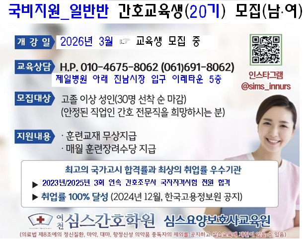 여천심스간호학원에서 국비지원(간호20기, 2026년 3월)을 모집합니다. '간호교육의 혁신' 여천심스간호학원 은 ▷ 높은 취업률로 2026년 훈련비 우대 국비지원 훈련기관 선정 ▷ 2023년 하반기와 2025년 하반기 3년 연속 간호조무사 자격시험 『전원합격』 청암대학교 간호학과 겸임교수/대표 원장 직강 여천심스간호학원에서 여러분의 새로운 꿈을 위한 디딤돌이 되겠습니다. 새로운 희망이 되어 드리겠습니다. 여천심스간호학원에서 무료 국비(간호20기) 교육생 을 모집합니다. ■ 개강일 : 2026년 03월 ■ 수강대상자 ▷실업자/근로자 상관없이 누구나 국비 수강 가능 ▷일반 내일배움카드 ☞매월 최대 116,000원 훈련장려금 지급 ■....... <img src="https://blogthumb.pstatic.net/MjAyNTEyMDlfNjEg/MDAxNzY1MjQ3MjA4NDk5.s9Ha3o6TtRFzQ_eh4X9jCLcY0P95YPQY6x9AAv33NSMg.t-pW1JyGAmsFlv-ayryr6dbR6FiaTSSbcD9QDq-zrEUg.JPEG/%B0%A3%C8%A320%B1%E2_%B8%F0%C1%FD%B0%F8%B0%ED_%BD%C9%BD%BA%C1%A6%C0%DB.jpg?type=s3" />