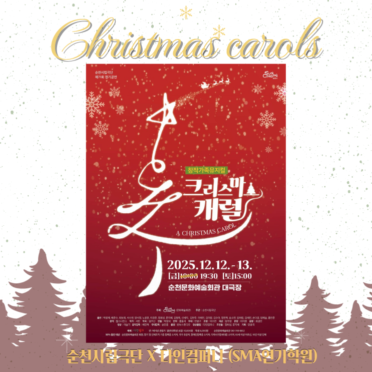 2025 정기공연 <크리스마스 캐럴> 공식 참여 안내 올해 겨울, SMA 연기학원에게는 너무나도 놀라운 소식이 찾아왔습니다. 저희 학원 학생 8명이 순천시립극단 정기공연 <크리스마스 캐럴>에 공식 참여하게 되었습니다. 이 소식이 특별한 이유는 단순한 ‘참여’가 아닙니다. 이번 공연은 전국 15개 국공립극단 중 하나인 순천시립극단의 정식 더 나아가 대극장에서 공연되는 작품입니다. 무대는 ‘학생들이 체험하는 무대’가 아니라 실제 티켓을 구매해야 입장할 수 있는, 티켓링크에 공식 등록된 정식 공연입니다. 저희 SMA 학생들은 이번에 배우·스태프·뮤지컬 팀과 함께 프로 배우들과 동일한 무대에 서게 되었습니다. 왜 이....... <img src="https://blogthumb.pstatic.net/MjAyNTExMjBfMjc1/MDAxNzYzNjQ3NTcyMzMx.n-Sv_kDvB3QTPa4MRY2HzecrAkQXZ5-9rUC1Si-_aVIg.Ne5rS_tR5atngmOrzvC8tfHXc8EzdYKSbAI_iKcnyMIg.PNG/KakaoTalk_20251120_224932612_01.png?type=s3" />