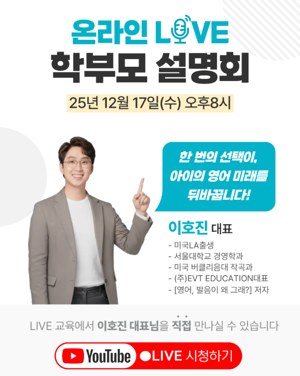안녕하세요, 학부모님! 좋은 소식이 있어 얼른 알려드리고자 퇴근전 블로그를 부라부랴 작성합니다~^^ 드디어 온라인 LIVE 학부모 설명회가 개최됩니다. 일정 안내 일시: 2025년 12월 17일(수) 오후 8시 방식: YouTube LIVE (편안한 집에서 참여 가능!) 강연자: 이호진 대표 이런 분들께 특히 추천합니다 EVT가 처음이라 궁금하신 학부모님 "EVT가 도대체 뭐지?" "우리 아이에게 맞을까?" 궁금하지만 선뜻 전화하거나 방문하기가 부담스러우셨나요? 온라인 설명회에서 부담 없이 편안하게 EVT의 모든 것을 알아보실 수 있습니다! ♀️ 바쁜 일상으로 시간이 없으셨던 학부모님 평일은 일하시느라 정신없....... <img src="https://blogthumb.pstatic.net/MjAyNTEyMDlfMzAg/MDAxNzY1Mjc4MDg5Mjk2.7r6K_iBTWtUhPX_bqYqyDNOhQaZirZIAIMjIMMPseO4g.uWe-tq7gwq9BUJZyfJX7ymh2qjPPZfLXO9UzdIXKQXIg.PNG/%BD%BA%C5%A9%B8%B0%BC%A6_2025-12-08_163732.png?type=s3" />